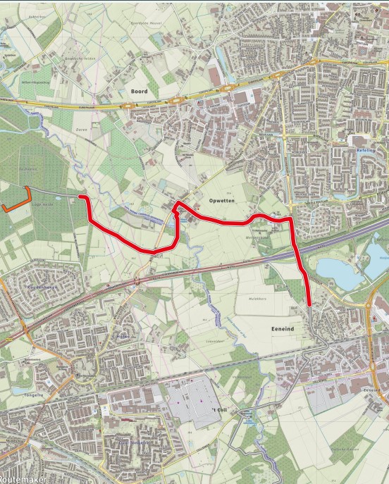 De route begint dus bij de Sonse brug. Vanaf daar gaat de wandeling langs de Sonse haven richting de Dommel. Op onderstaande kaart ziet u twee routes, de rode en de oranje. De oranje route is een alternatieve route in geval van een hoge waterstand in de Dommel. Aangezien daar nu geen sprake van is volgen we de rode route.