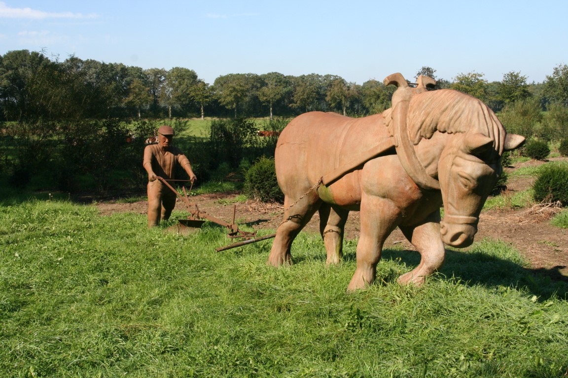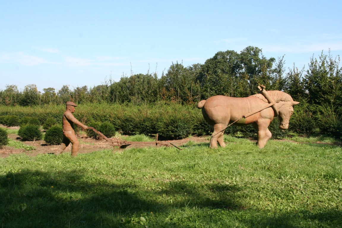 Het sculptuur “Verroeste Pk’s” gemaakt door Hannes Verhoeven naar een ets van Andreas Schotel. De boer op het land aan het werk met zijn paard, was jarenlang een vertrouwd beeld in het Esbeekse landschap. Hij ploegde, egde, zaaide en maaide. De boer, zijn paard en het werktuig waren een drie-eenheid. Zij vormden een geoliede machine. De paardenkracht bleef als het ware achter in het veld.