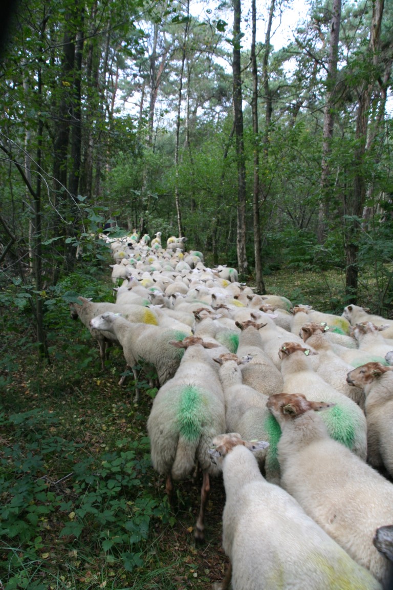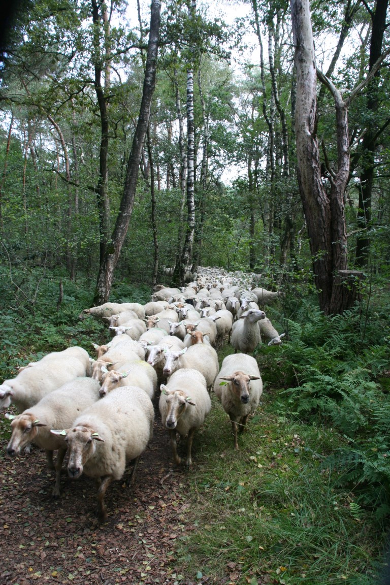 Dit tafereel verwacht je niet in het bos. Een kudde met ongeveer 350 schapen incluis schaapsherder en de bekende Border Collies.