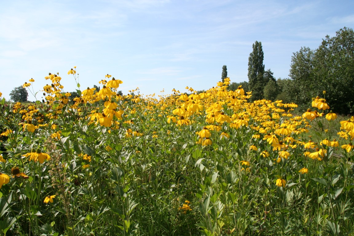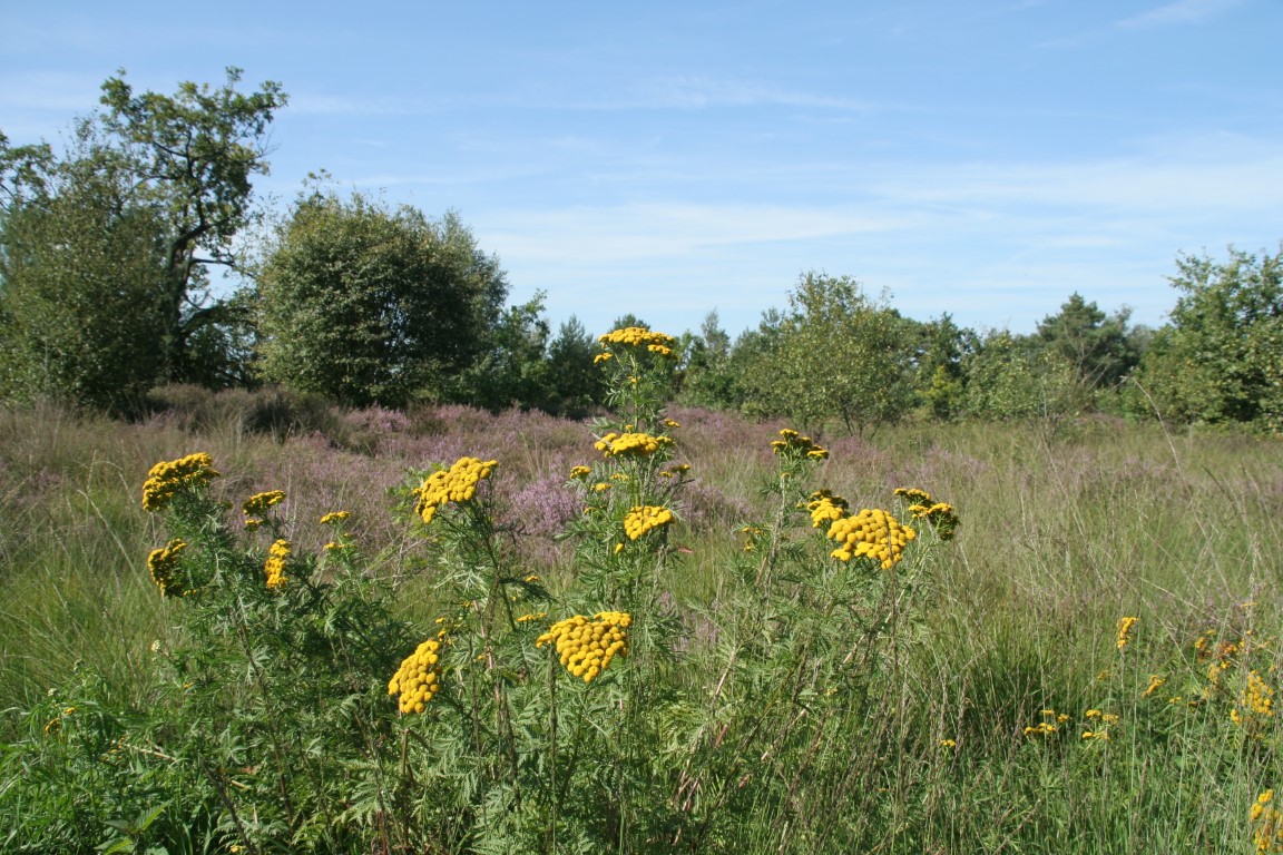 Rechtsboven Knoopkruid, rechtsonder Gewone Klit, linksonder Koninginnekruid, linksboven heide, boerenwormkruid en Amerikaanse vogelkers.