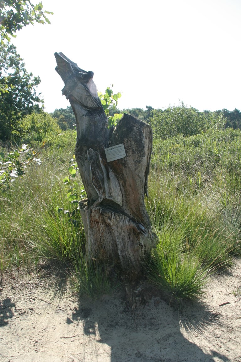 Met dit houten kunstwerk verlaten we de Plateaux – Hageven en wandelen weer verder richting Luijksgestel