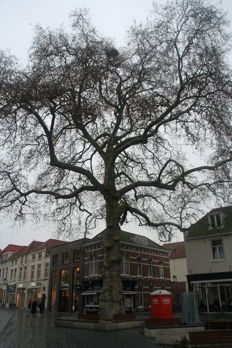 In Bergen op Zoom staat op het Gouvernementsplein de zogeheten ‘Dikke Boom’, een plataan van inmiddels wel zo’n anderhalve eeuw oud. Hij werd geplant in wat sinds de achttiende eeuw de tuin van het Gouvernementsgebouw was, op de plek waar in de middeleeuwen het Sint-Maartensgasthuis had gestaan. In de dertiende eeuw, was het gebouw dat wij nu kennen als het Gouvernement, het Sint Maartensgasthuis. Een ziekenhuis dus. Vanaf 1600 woonde hier echter de Gouverneur. Vandaar ook de naam. In 1771 werd het pand helemaal vernieuwd. De Sint Maartenskapel werd afgebroken en op de plaats daarvan kwam er een voortuin. Van 1819 tot 1922 was het pand in gebruik als militair hospitaal. In het pand op de foto naast de Gouverneur bevond zich vroeger “De Waag”. De historie van dit pand gaat terug naar 1355. Een pand aan de Zuivelstraat waar het wegen van boter en later ook andere dingen centraal stond! Onderaan het voormalige postkantoor. Dit zat in een gebouw uit 1912.