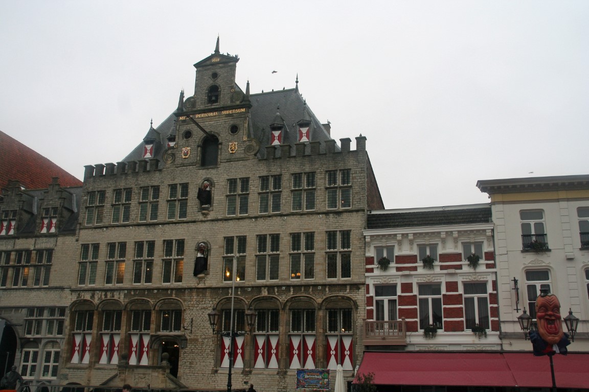 Op de historische markt vinden we een aantal oude gebouwen. Het oude stadhuis, de oudste herberg van Nederland Hotel de Draak, de Teerkamer en de Peperbus. Het stadhuis: Het stadhuis bestaat eigenlijk uit drie panden. Het linkergebouw met de poort, ‘de Oliphant’. Het eigenlijke stadhuis, ‘het schepenenhuis’ in het midden (de hoofdingang en de drie vensters aan de linkerzijde). En het pand aan de rechterzijde, ‘Leeuwenborgh’. Het eigenlijke stadhuis, ‘het schepenenhuis’, is al 600 jaar oud en gebouwd tussen 1398 en 1403. De gevel van het gebouw kende een aantal beelden die de vier kardinale deugden voorstellen, waarvan er twee nog op de gevel staan. Onder staat Justitia, ze heeft een zwaard en een weegschaal, ze staat voor de gerechtigheid. Het bovenste beeld is Prudentia, ze had oorspronkelijk een spiegel vast maar deze is verdwenen, aan de houding kan dit echter wel herleid worden. De spiegel stond voor wijsheid en voorzichtigheid. Bij de restauratie in de jaren 30 zijn echter ook twee beelden verdwenen: het eerste is Fortitudo, de moed en sterkte. De nis waar hij in stond is gedicht met een houten luik. En het tweede beeld is Temperantia, de Gematigdheid. Zij stond op de nok van de gevel. Boven de poort bij het Sint-Annastraatje is nog een beeld tevoorschijn gekomen: Sint Getrudis de patroonheilige van Bergen op Zoom. De tekst Mille Periculus Supersum staat op het stadhuis. Dit is een Latijnse spreuk die “Duizend gevaren kom ik te boven” betekent, wat vaak wordt geassocieerd met de veerkracht van de stad Bergen op Zoom tijdens de Tachtigjarige Oorlog.
