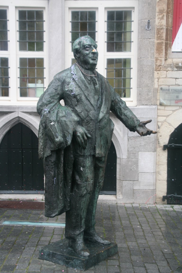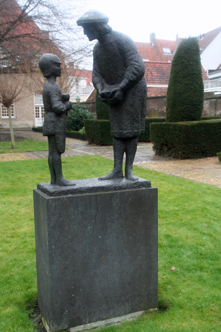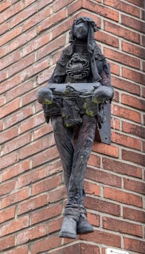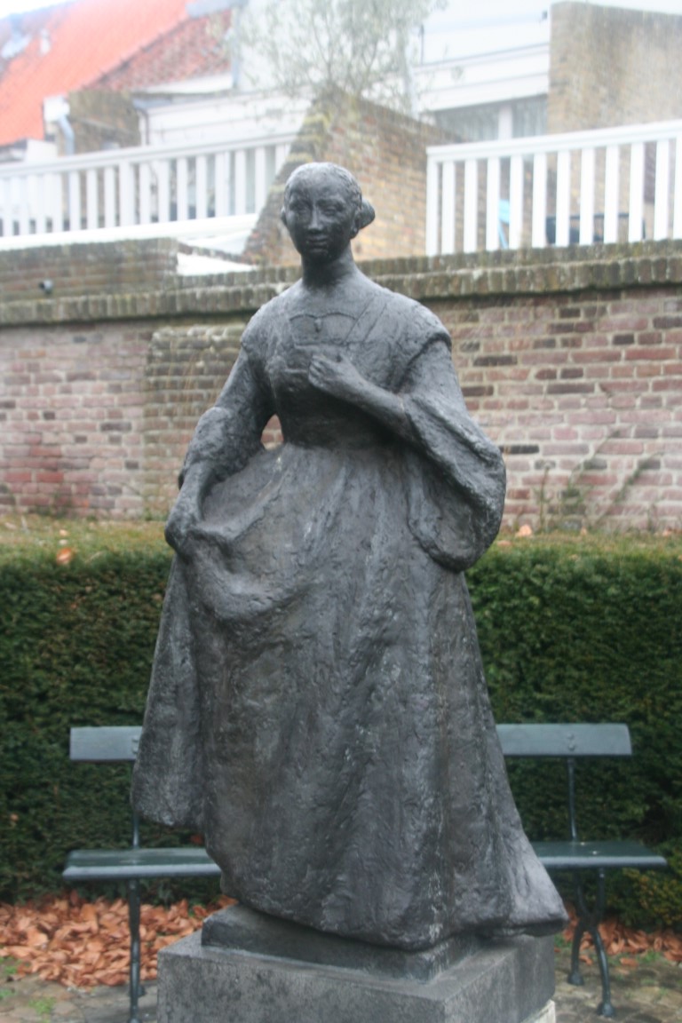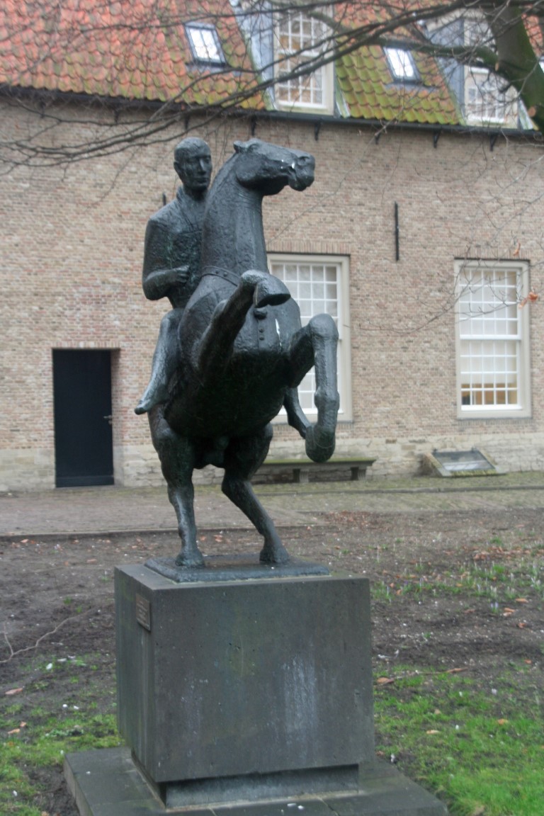 Foto links: Het beeld Chevalier. Tweede foto van links: Op deze foto staat het beeld van Anthonis Keldermans met zijn jonge zoon Rombout II. In 1476 werd hij door het markiezaat Bergen op Zoom aangesteld tot hoofdbouwmeester. Hij ontwierp en bouwde er de Sint-Gertrudiskerk (1489) en het Markiezenhof (1485). Op beide foto’s rechts een Standbeeld van Johanna de Waanzinnige. Johanna van Castilië, ook bekend als Johanna de Waanzinnige, vrouw van Filips de Schone en moeder van Karel V. Johanna heeft op het Markiezenhof gelogeerd.