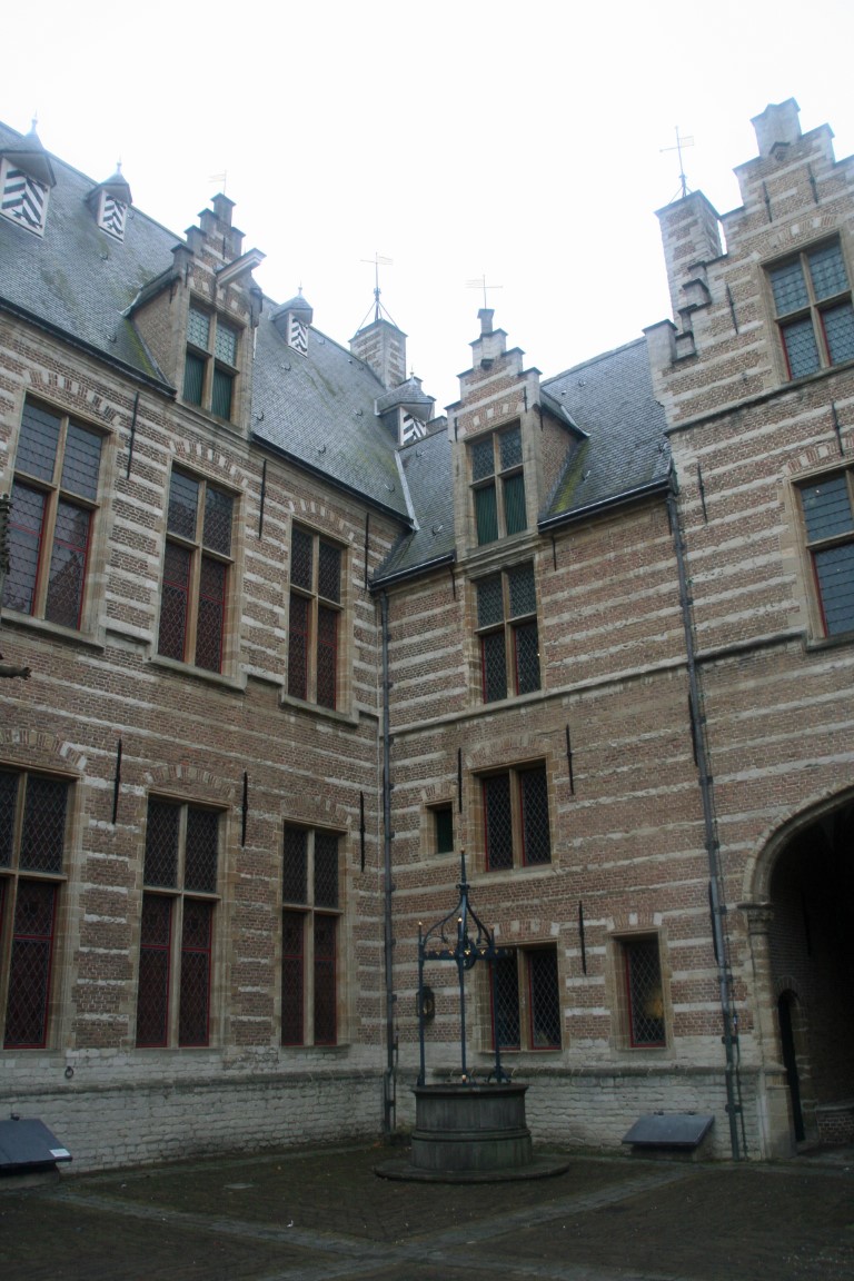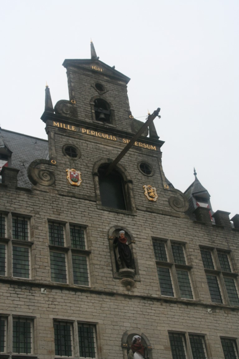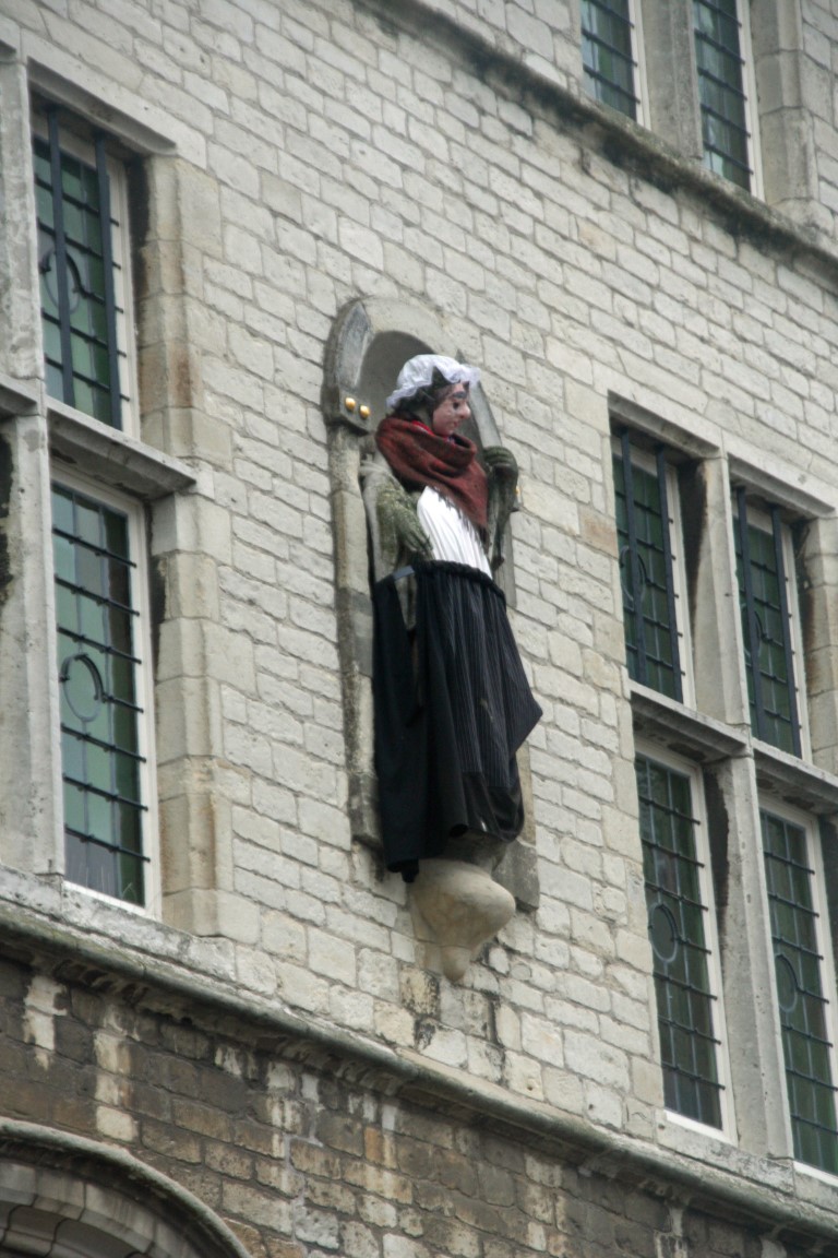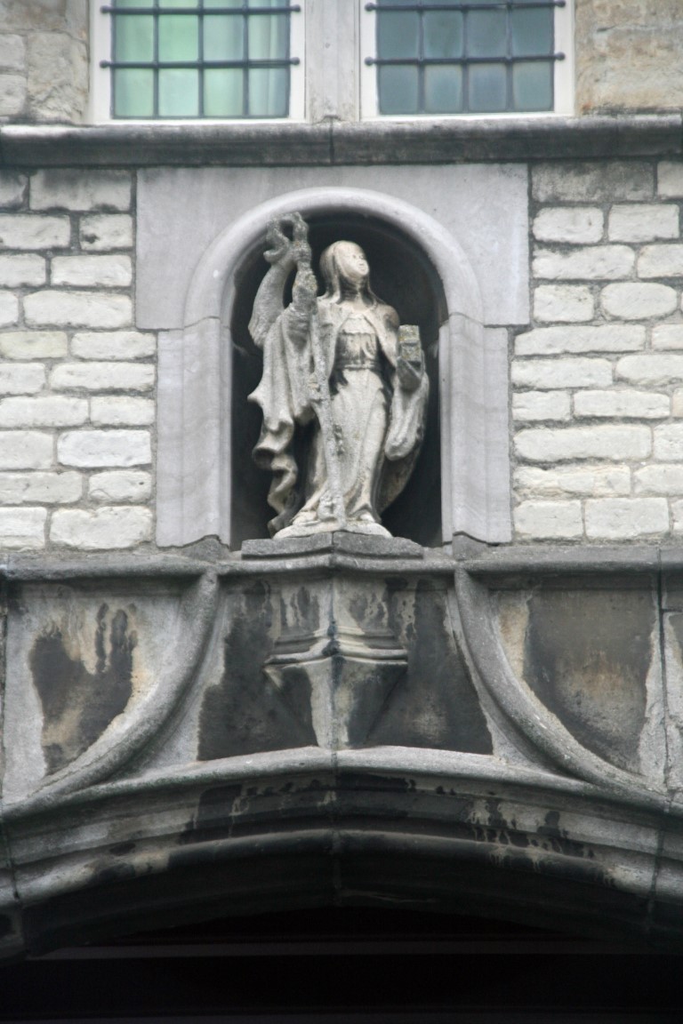 Foto links: Het beeld Chevalier. Tweede foto van links: Op deze foto staat het beeld van Anthonis Keldermans met zijn jonge zoon Rombout II. In 1476 werd hij door het markiezaat Bergen op Zoom aangesteld tot hoofdbouwmeester. Hij ontwierp en bouwde er de Sint-Gertrudiskerk (1489) en het Markiezenhof (1485). Op beide foto’s rechts een Standbeeld van Johanna de Waanzinnige. Johanna van Castilië, ook bekend als Johanna de Waanzinnige, vrouw van Filips de Schone en moeder van Karel V. Johanna heeft op het Markiezenhof gelogeerd.