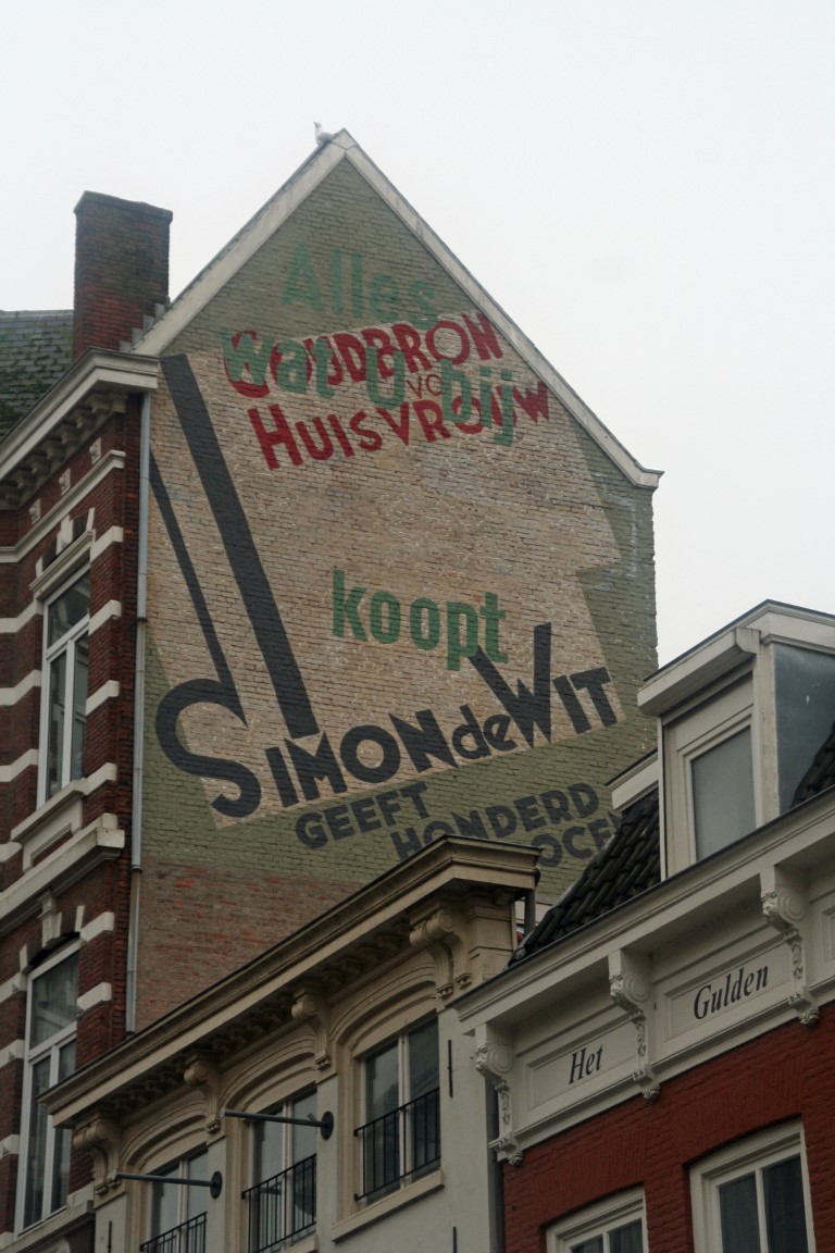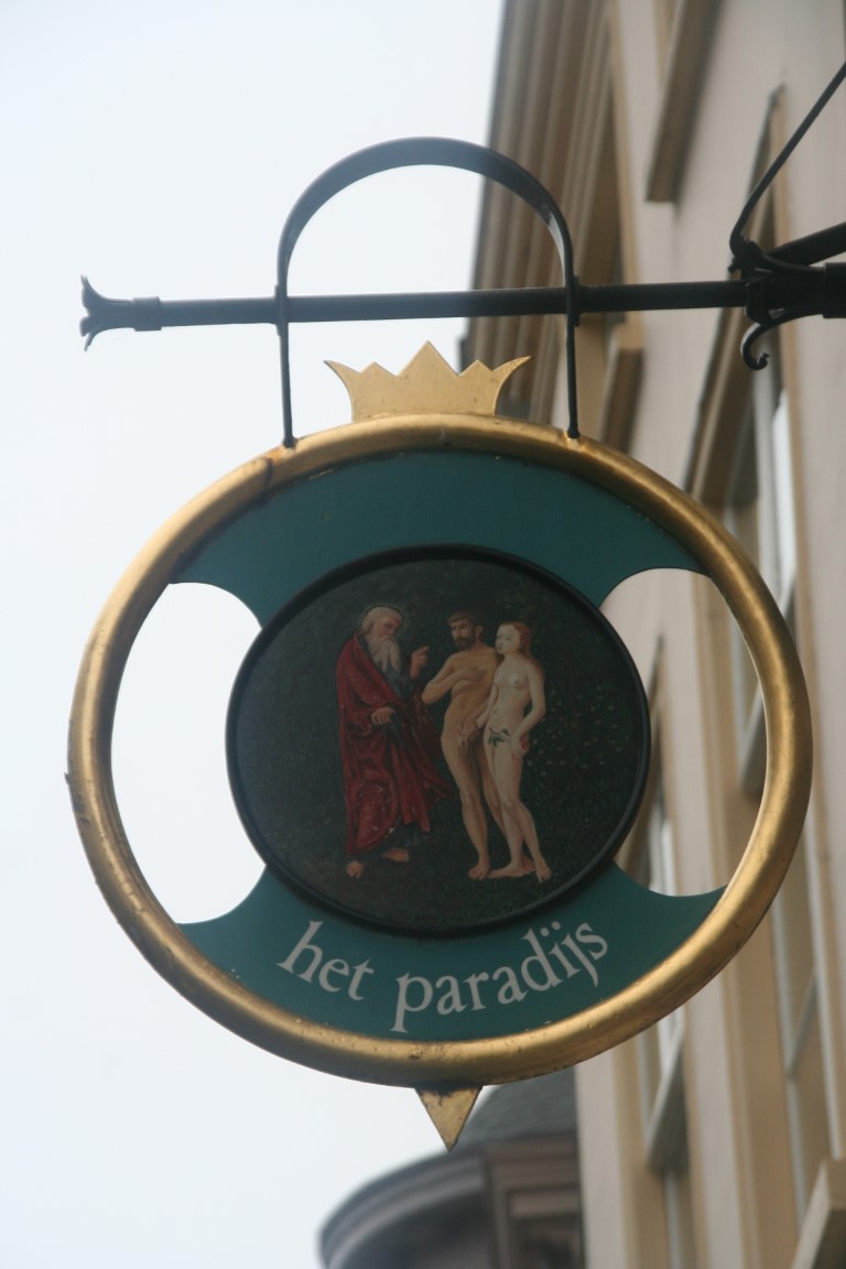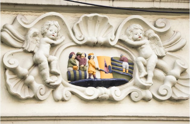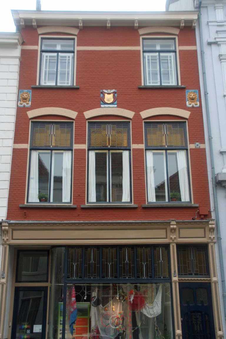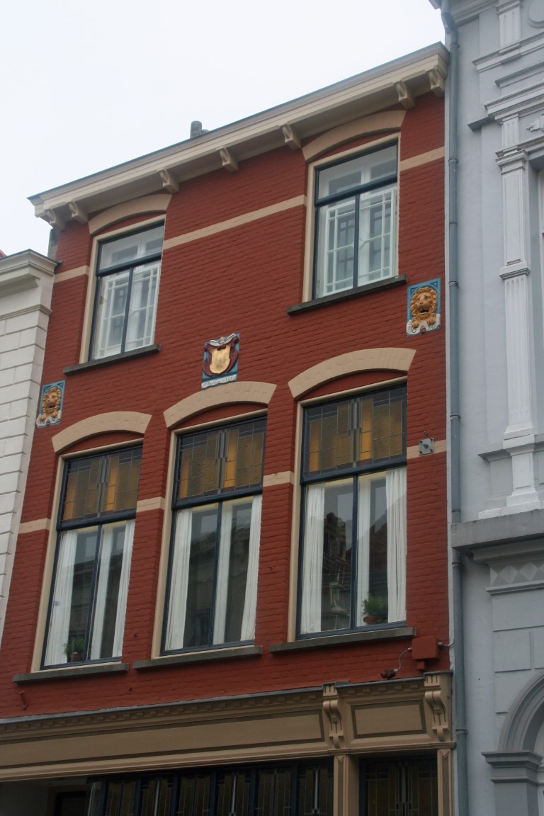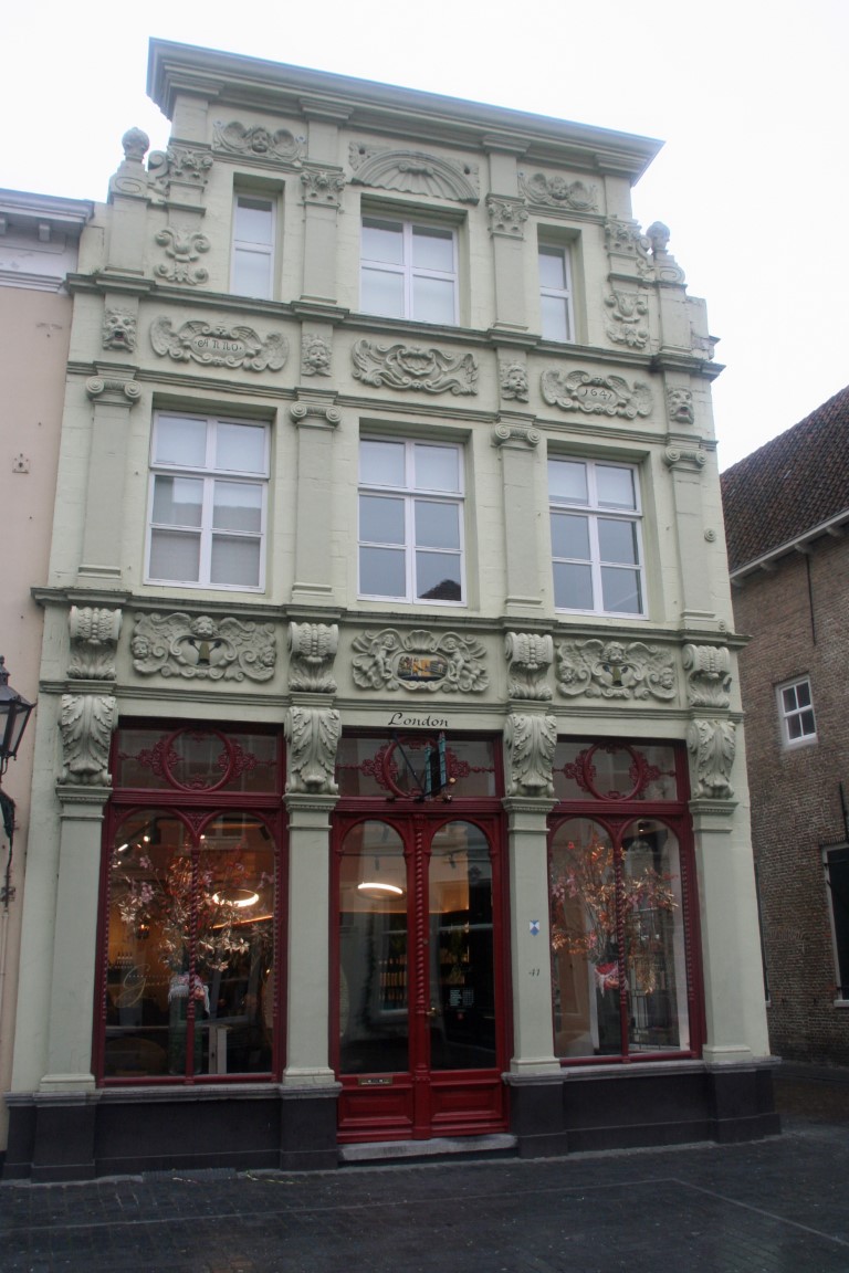Onder: Huize London. Toen de gevel van deze plek in de Lievevrouwestraat in 1647 werd uitgebreid en opgeleukt, zat er een brouwerij in dit pand gevestigd. In de gevel zijn engeltjes verwerkt, het pand blijkt uit 1647 te komen en kleine mannetjes met felgekleurde kleren lijken een potje bier te drinken. De gevel vertelt daarmee de vroegere functie van het pand.