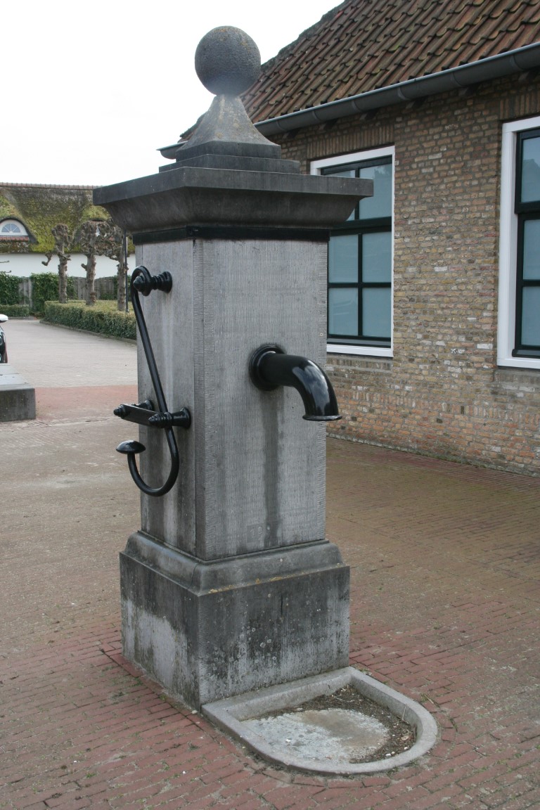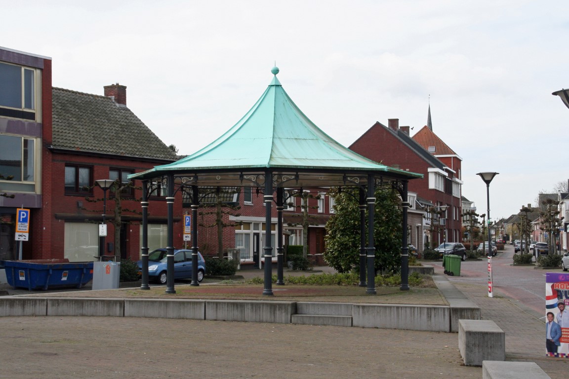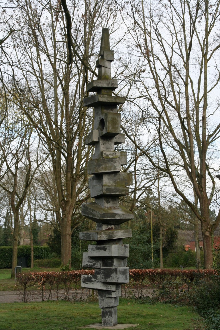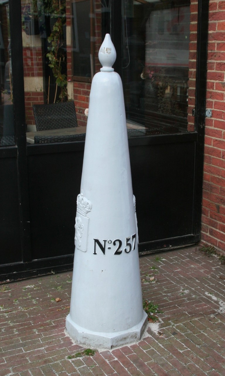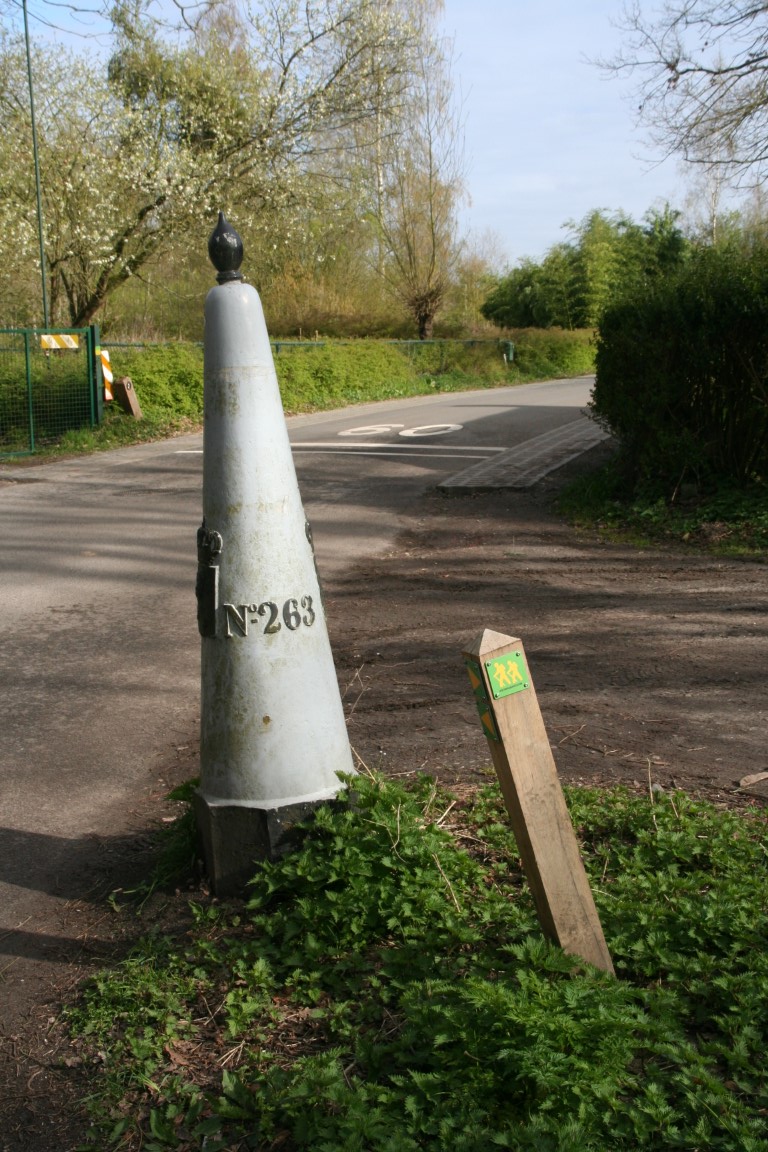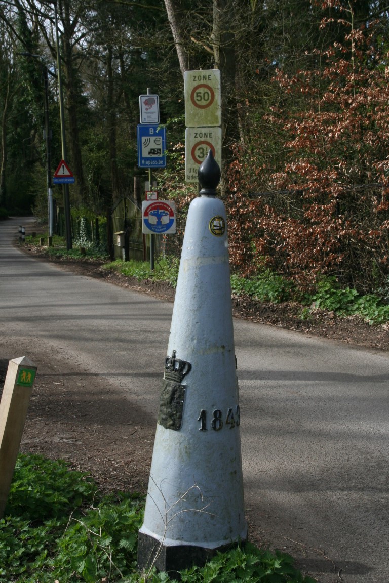 Eén van de gietijzeren grenspalen die de grens met Nederland markeren; achtkantige, bakstenen basis en een kegelvormig gietijzeren gedeelte bekroond door een gestileerde denappel; op de grenspaal bevinden zich de wapenschilden van België en Nederland, een volgnummer en het jaartal 1843, verwijzend naar het jaar waarin de grensscheiding geregeld werd.