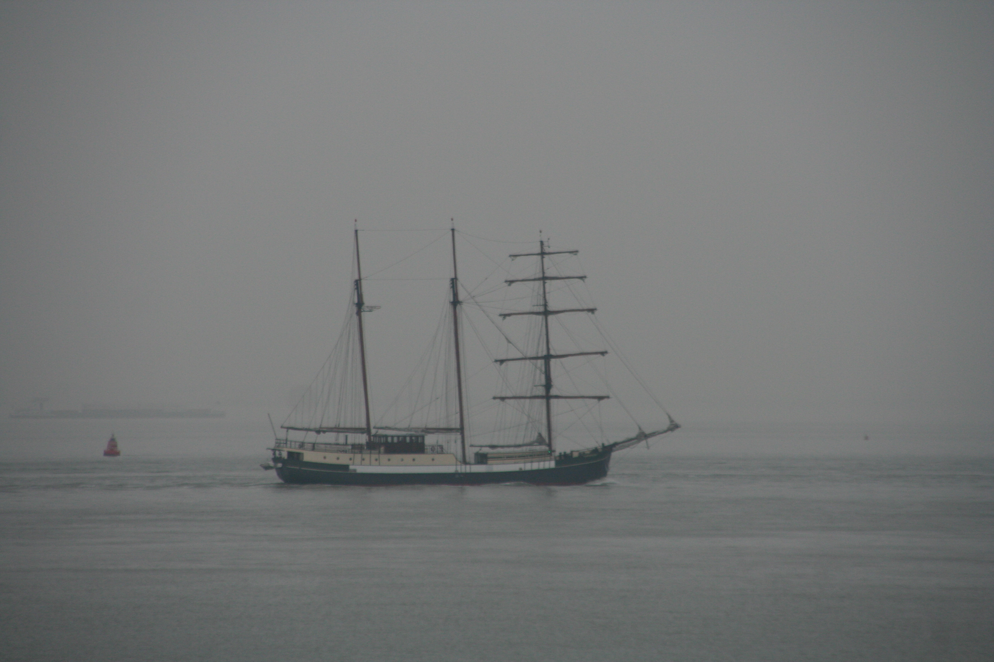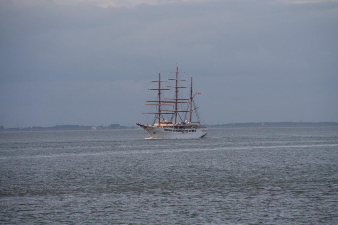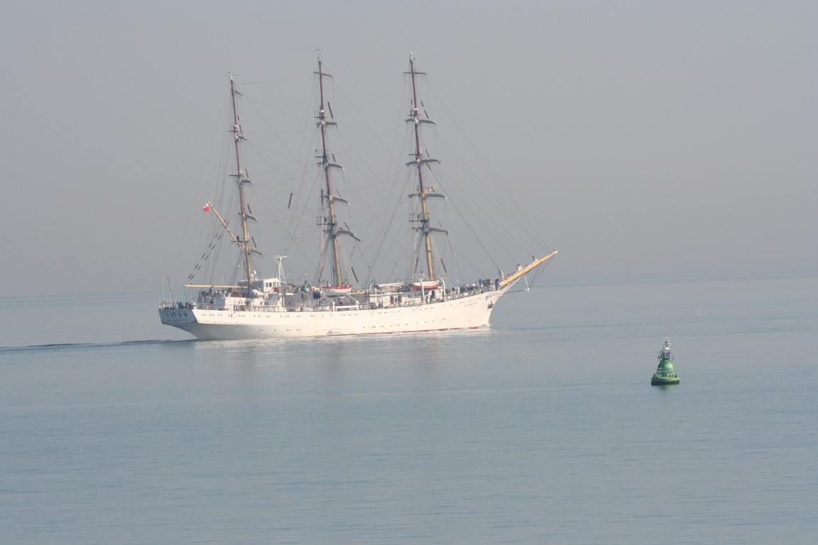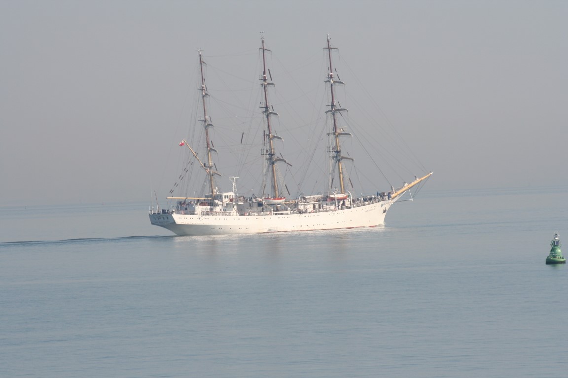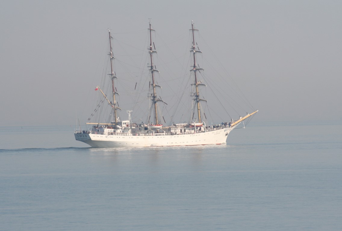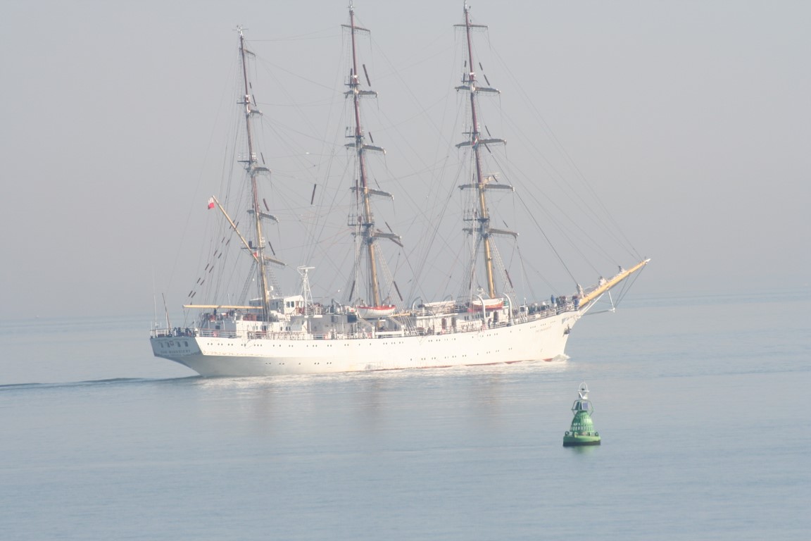 De Poolse driemaster en opleidingsschip, de Dar Mlodziezy, op weg naar Antwerpen.