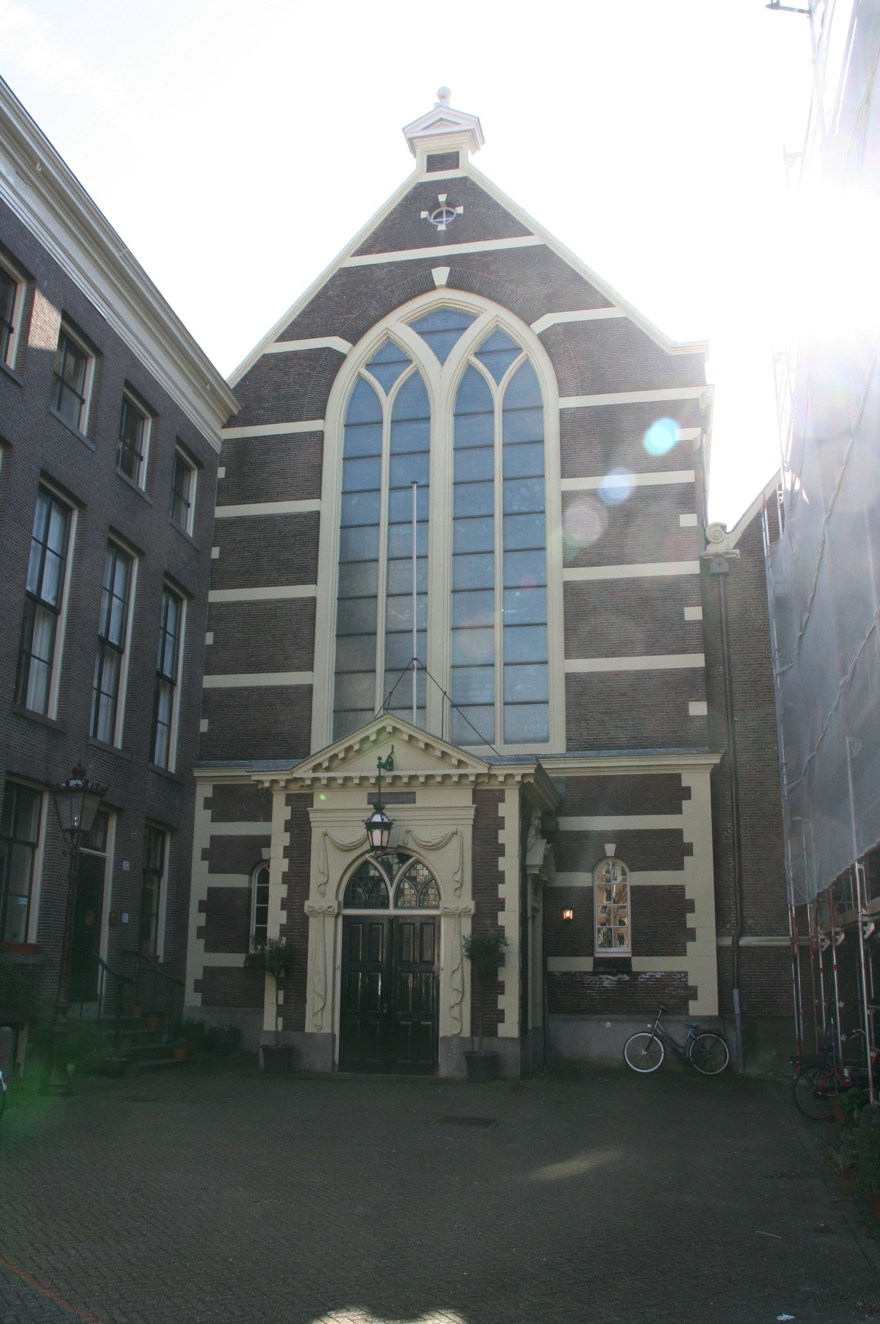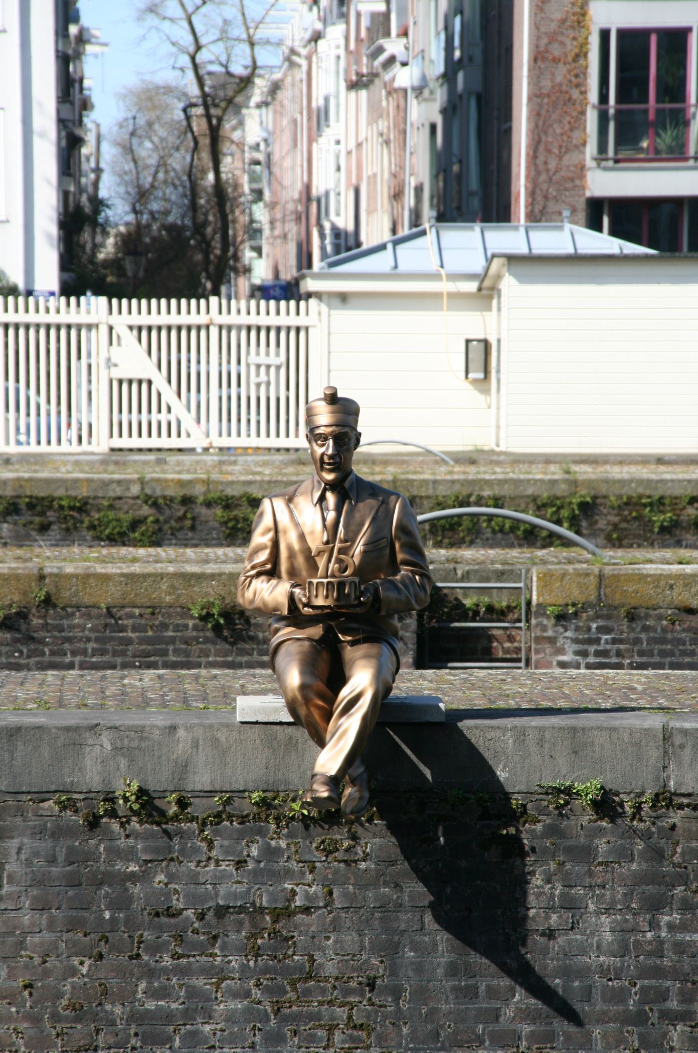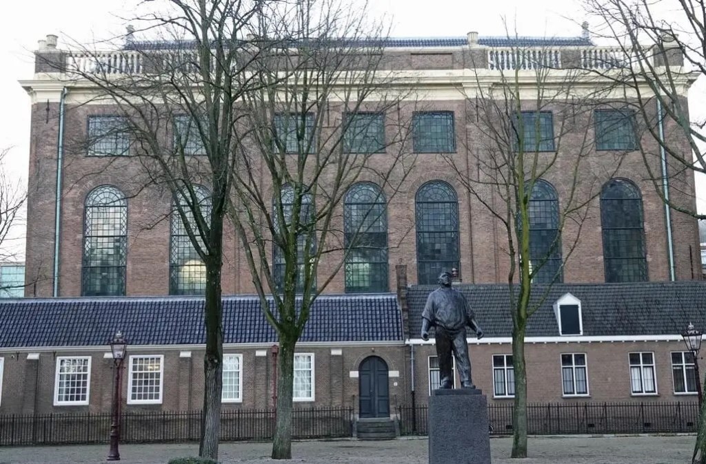 Portugese synagoge met daarvoor op het beeld van De Dokwerker op het Jonas Daniël Meijerplein. Symbool van de februari staking in 1941.
