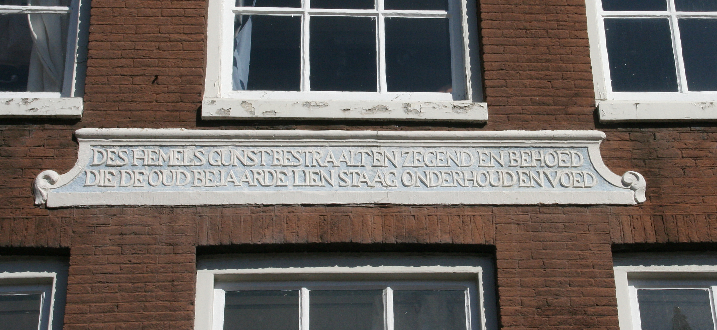 De twee tekststenen zaten tot 1932 in de gevel van Weesperstraat 33, waar in 1751 de broederschap Mishenet Zequenim een tehuis stichtte voor behoeftige oude joodse mannen. In 1794 werd de broederschap eigenaar van het grotere pand aan de Nieuwe Herengracht 33, dat toen als tehuis in gebruik werd genomen. In 1932 zorgde het Koninklijk Oudheidkundig Genootschap ervoor dat de twee stenen uit het, te slopen pand in de Weesperstraat ingemetseld werden op de Nieuwe Herengracht. In februari 1943 werden de bejaarde bewoners door de bezetter weggevoerd en kort daarna werden de teksten op de beide gevelstenen door weghakken onleesbaar gemaakt. Het oppervlak werd met een laag cement dichtgesmeerd.