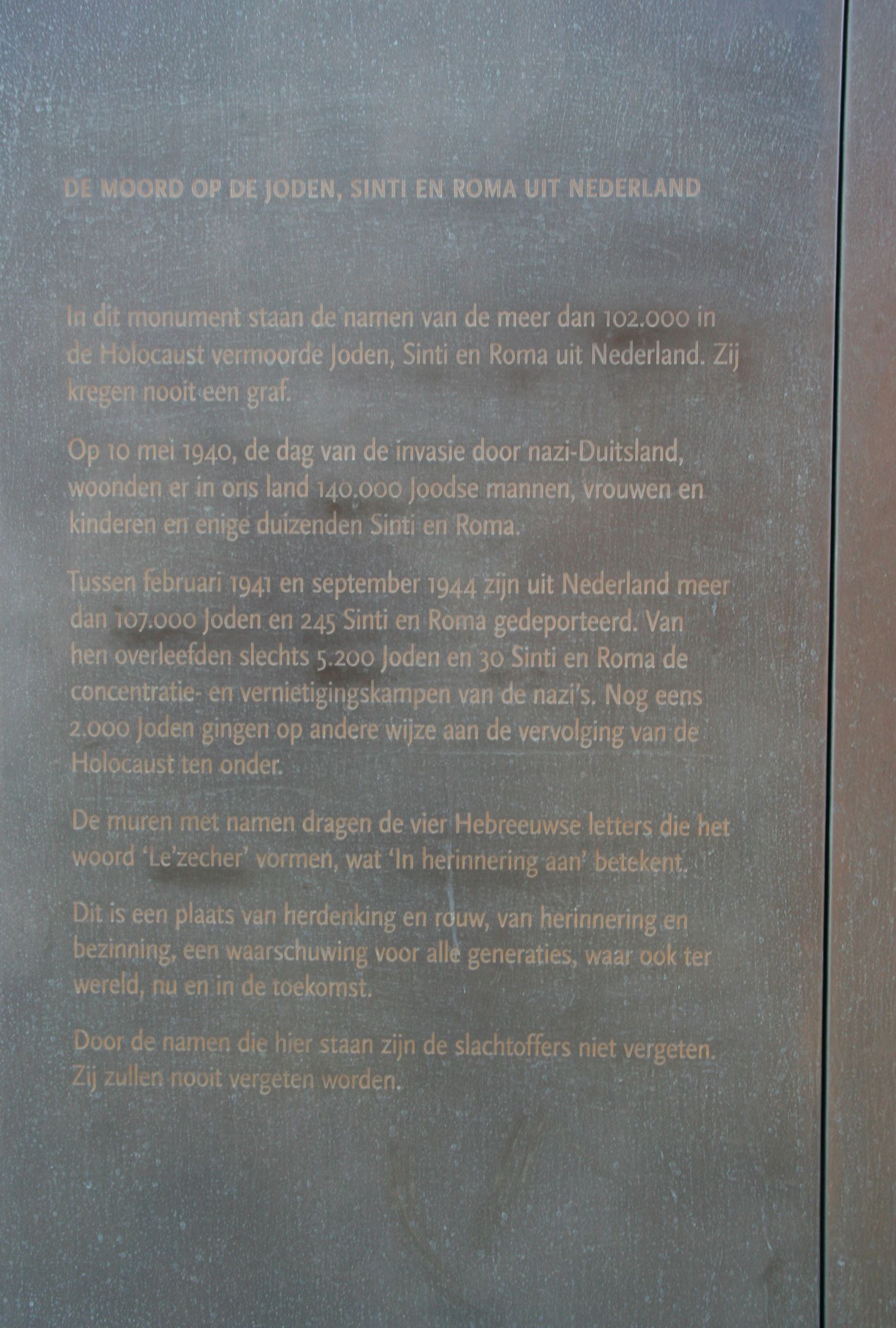 Ruim 102.000 slachtoffers van de Holocaust hebben na meer dan 75 jaar na de Tweede Wereldoorlog een eigen monument gekregen. In Amsterdam is een monument verrezen met alle namen van de Nederlandse Holocaustslachtoffers die geen graf hebben. Alle namen van Joden, Sinti en Roma die vanuit Nederland zijn vervolgd en gedeporteerd, alsmede gedeporteerde Nederlandse Joden woonachtig in andere landen, die in naziconcentratie- en vernietigingskampen zijn vermoord, alsook zij die zijn omgekomen door honger of uitputting tijdens transporten en dodenmarsen en waar geen graf van bekend is