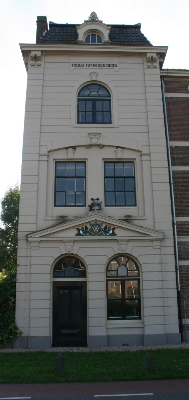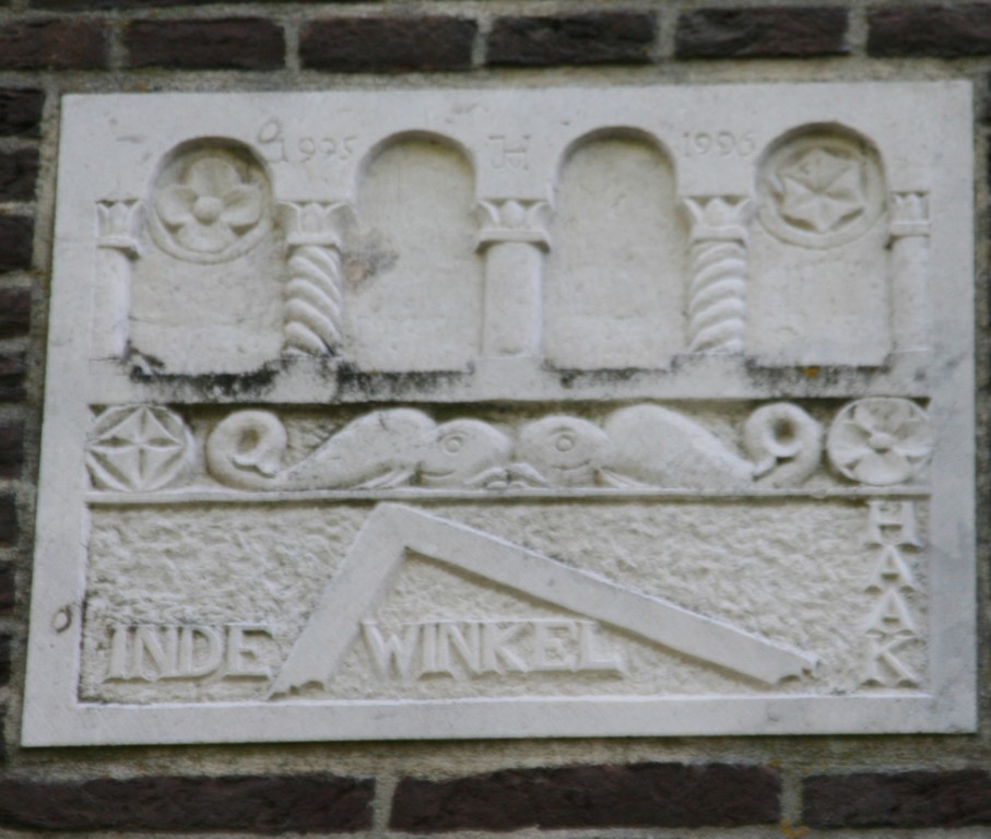 Oud woonhuis gebouwd in 1910 met gevelsteen waarop een dolfijn is afgebeeld.