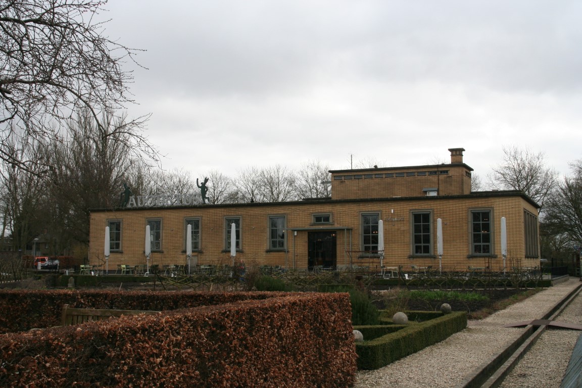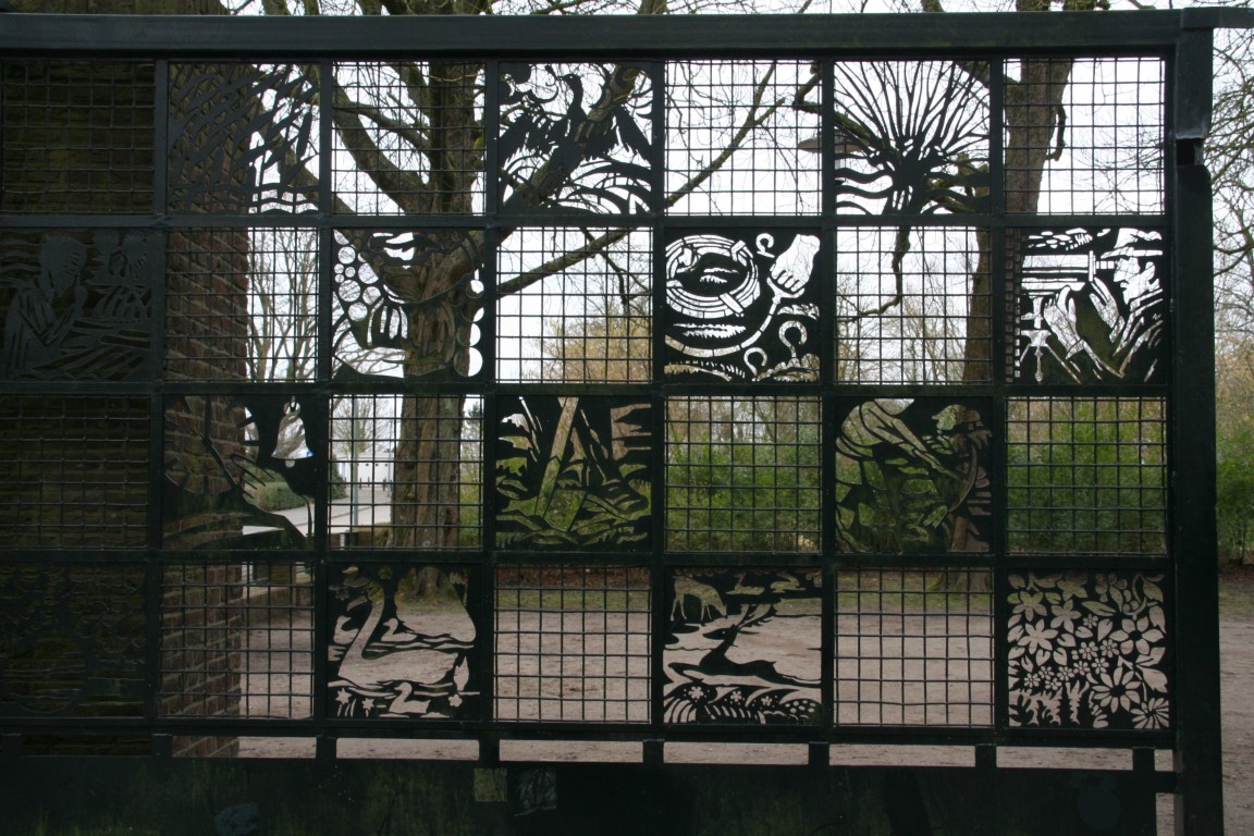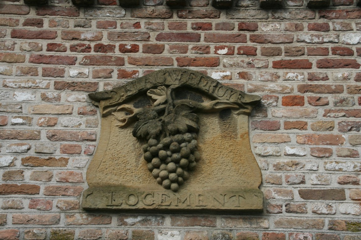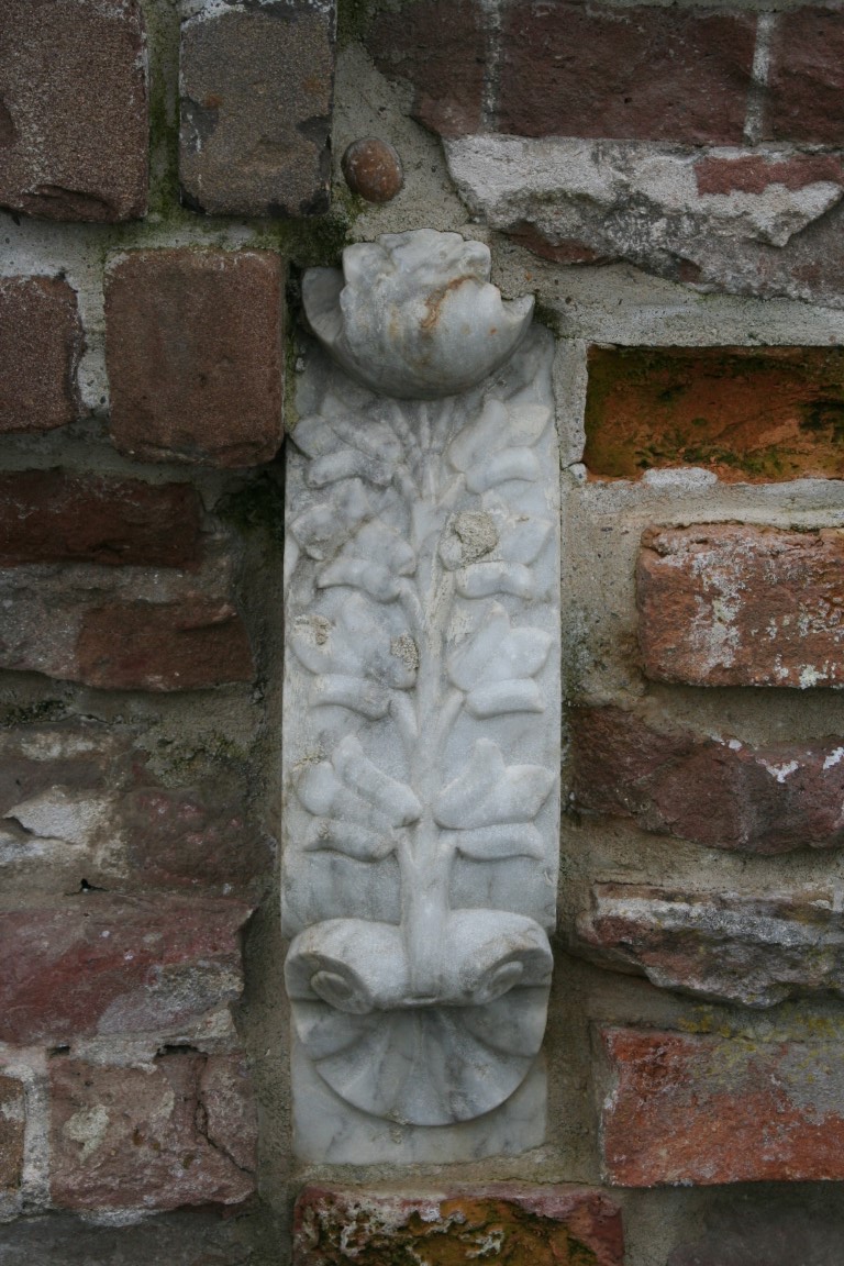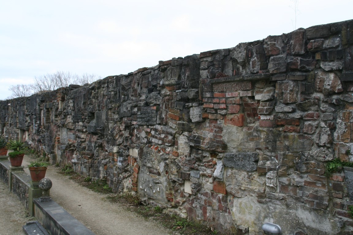 De ommuurde tuin van het complex. Deze muur is opgebouwd uit brokstukken van de gesloopte waterbassins en Belgisch hardsteen van een gesloopte kade op de kop van de Staart.