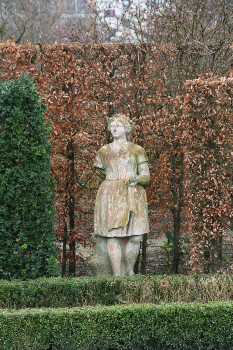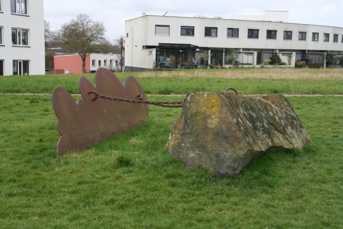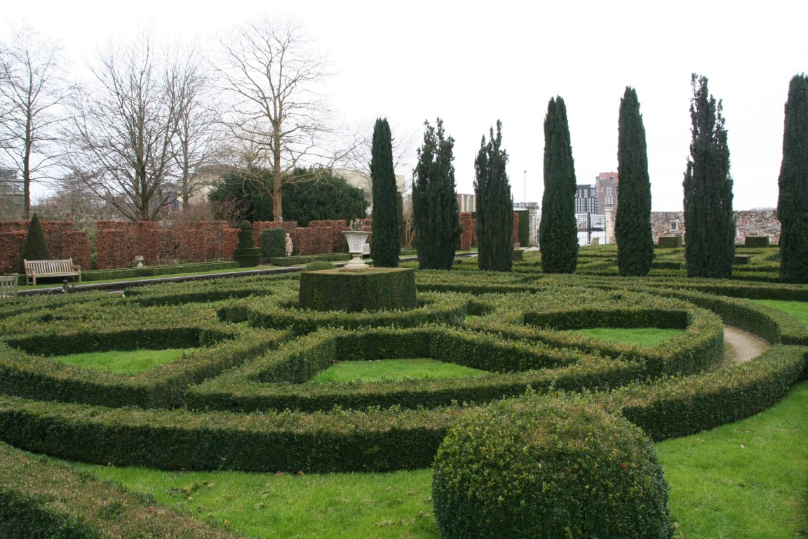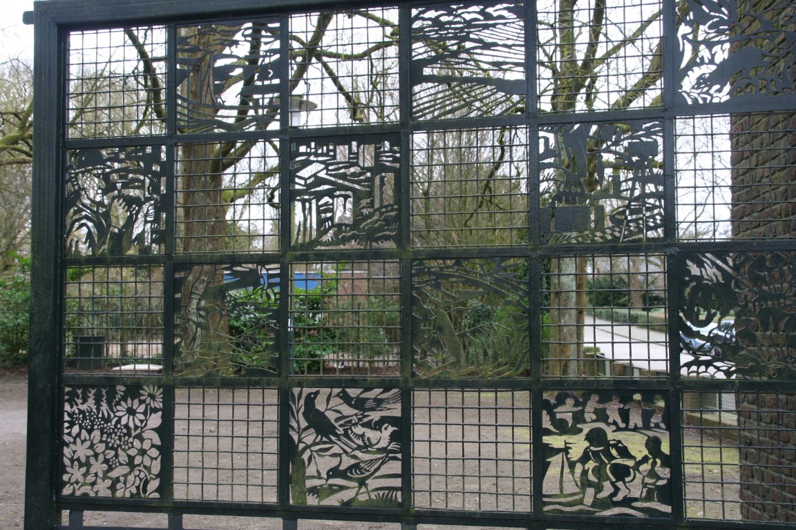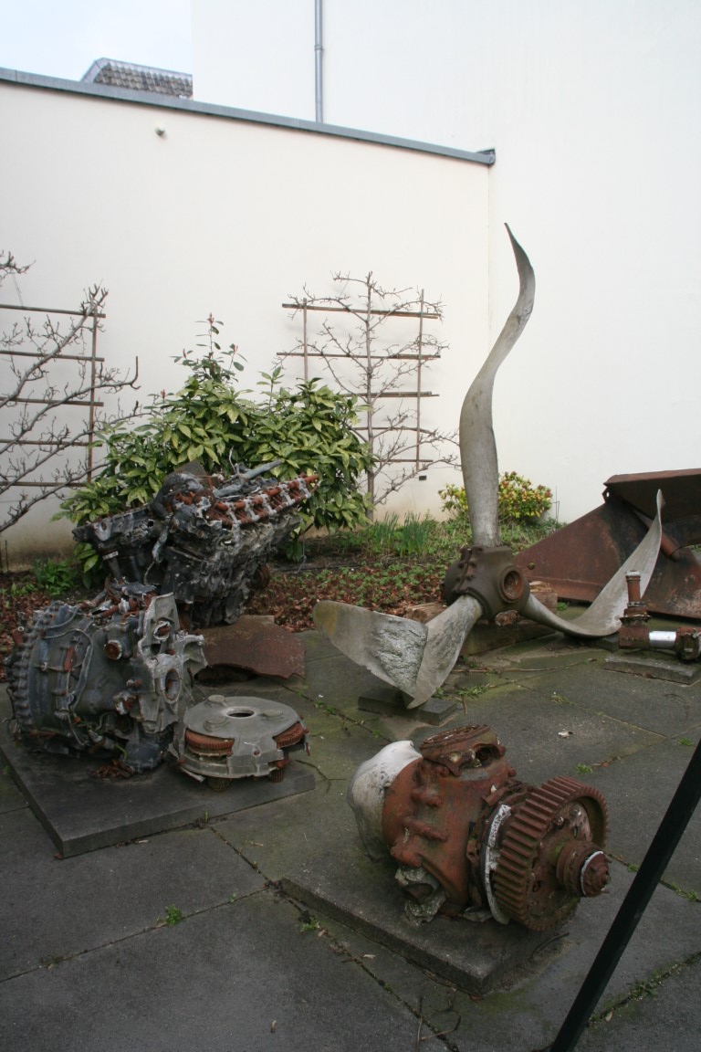 De ommuurde tuin van het complex. Deze muur is opgebouwd uit brokstukken van de gesloopte waterbassins en Belgisch hardsteen van een gesloopte kade op de kop van de Staart.