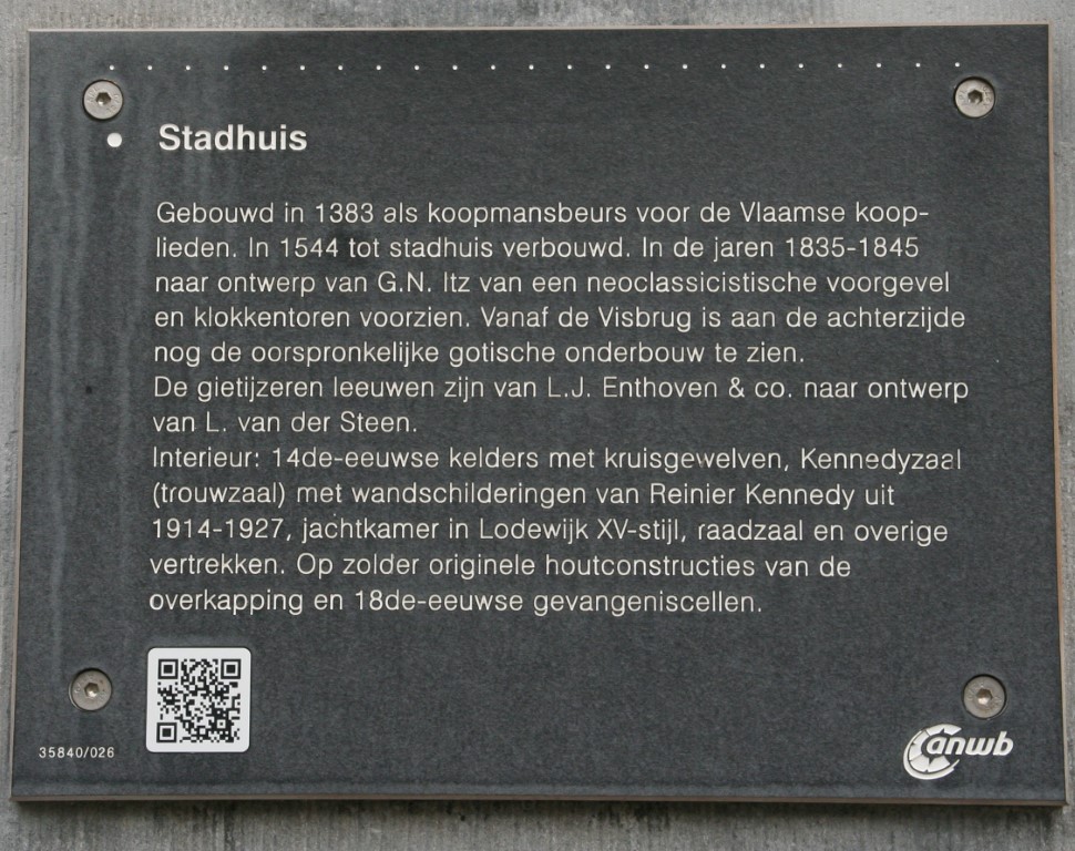 Het voormalige Stadhuis van Dordrecht stamt uit 1383–1388. Het was oorspronkelijk een markthal die in 1544 werd verbouwd tot stadhuis. Het werd oorspronkelijk gebouwd als lakenhal voor Vlaamse kooplieden. Deze ‘Vlaamse hal’ was daarnaast waarschijnlijk ook in gebruik als vleeshal. In 1544 werd de hal verbouwd tot stadhuis. In 1679 werd de ingang verplaatst van de Groenmarkt naar het nieuw aangelegde plein (het huidige Stadhuisplein).