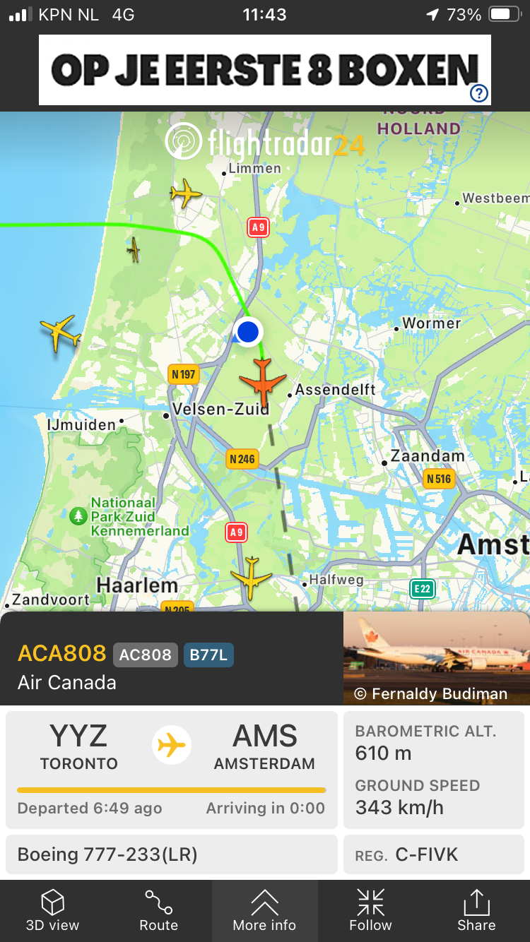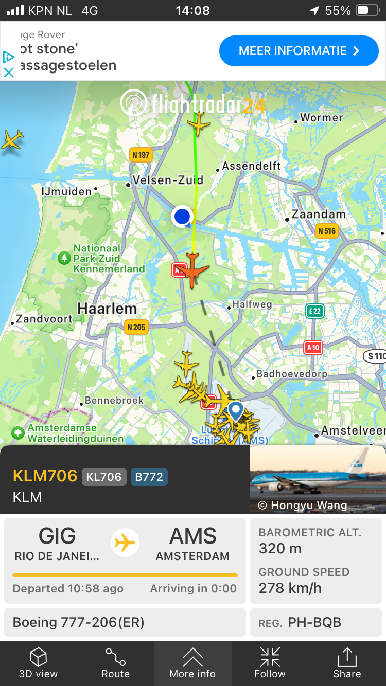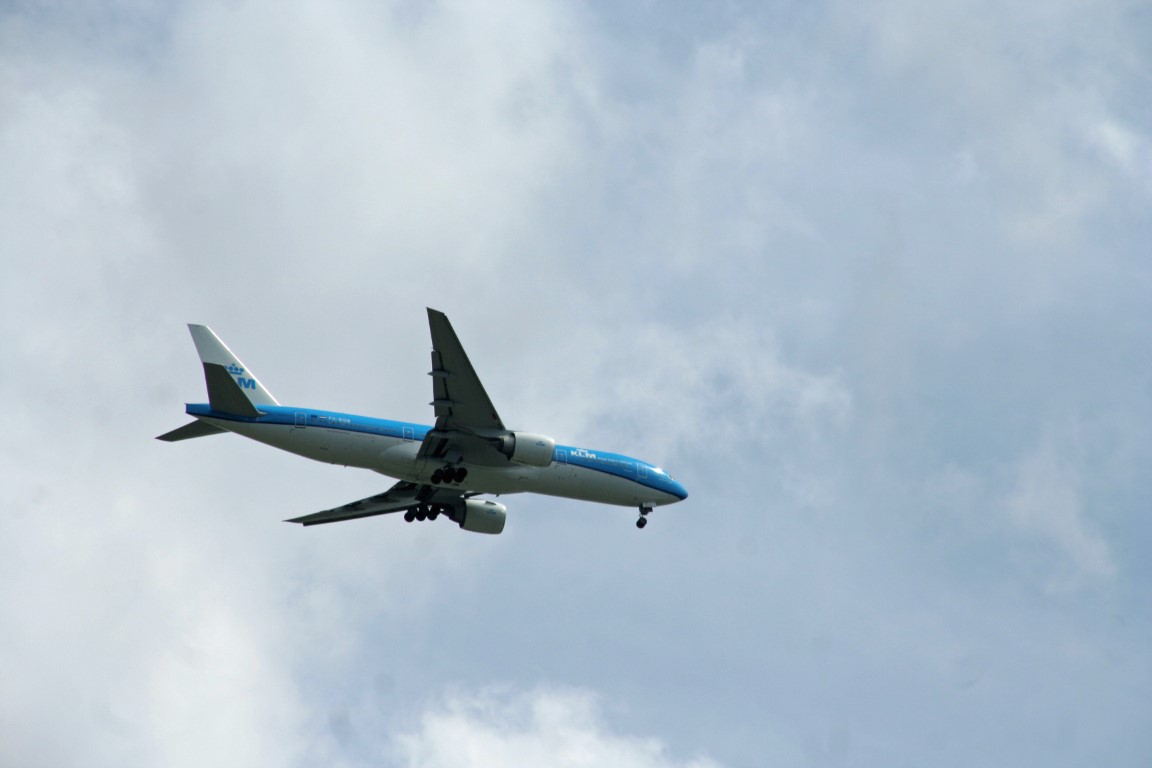 Het laatste gedeelte van deze etappe wandelen we onder de aanvliegroute van Schiphol. De vliegtuigen komen over op een hoogte tussen de 600 en 300 meter! Iedere 3 minuten komt er een vliegtuig over.