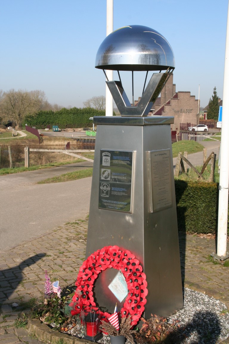 Op de sokkel, van dit monument dat een gestileerde parachute toont met daarvoor de “V” van victorie, zijn drie plaquettes bevestigd. Op de eerste staat in het Nederlands in het kort de veroveringsgeschiedenis van de Maasbrug te lezen en dat de naam ‘John S. Thompsonbrug’ op 17 sept. 2004 werd onthuld door Mrs. Phyllis Thompson. Op de tweede staat ditzelfde in het Engels. De derde is voorzien van de emblemen van de E-compagnie, 2de bataljon van de 82ste Amerikaanse luchtlandingsdivisie, het Britse 30ste legercorps en de Koninklijke ‘Prinses Irenebrigade’. Deze laatste nam nadat de Amerikanen en Engelsen verder getrokken waren de bewaking van de brug over.