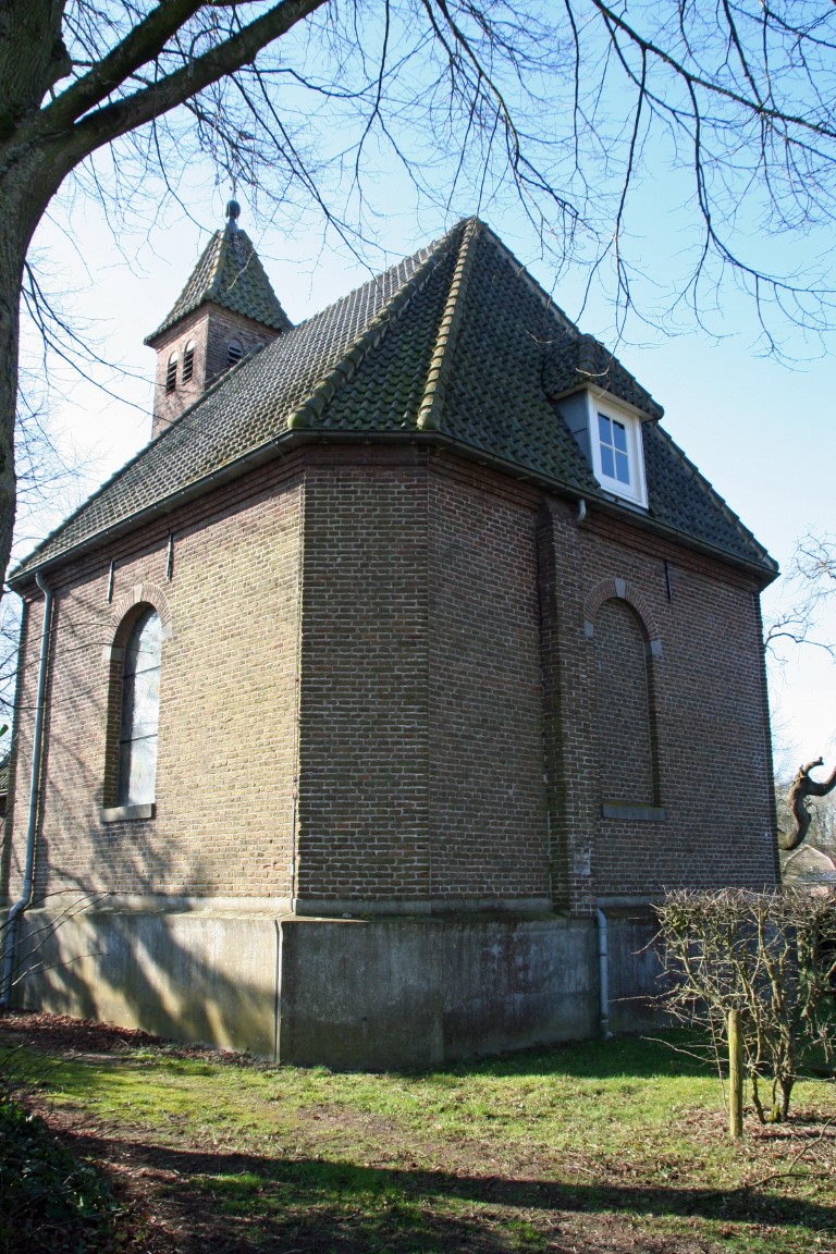 Zaalkerkje uit 1804-1805. Het torentje en het uitgebouwde portaal zijn in 1934 toegevoegd bij een verbouwing, ter vervanging van het oorspronkelijke koepeltorentje. Eind jaren 1960 verloor het zijn religieuze functie.