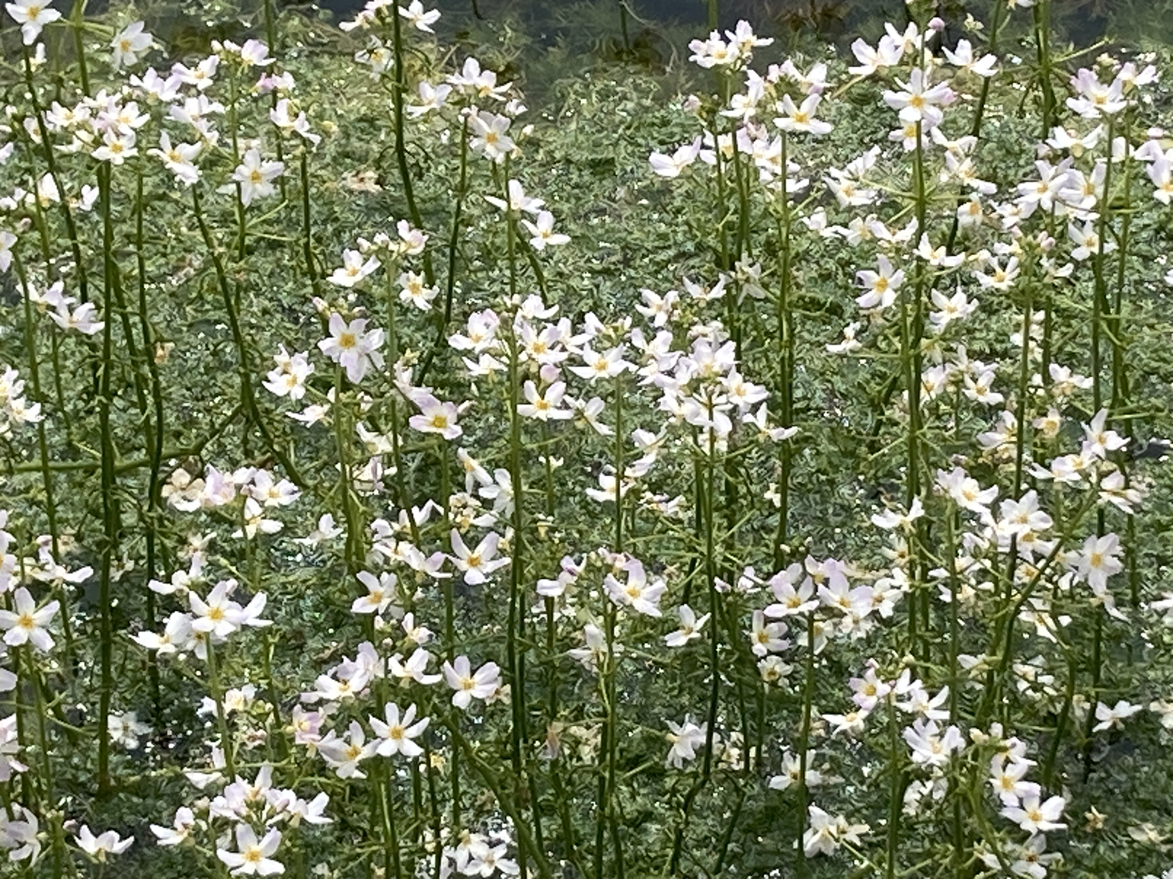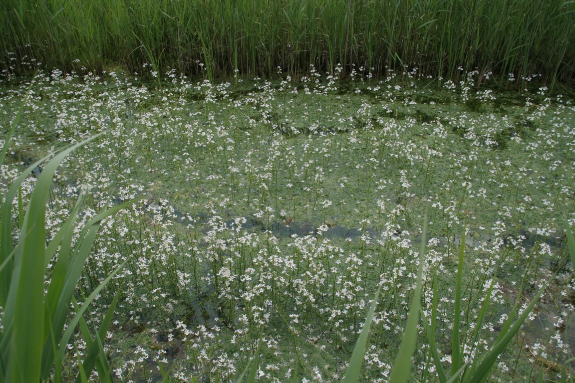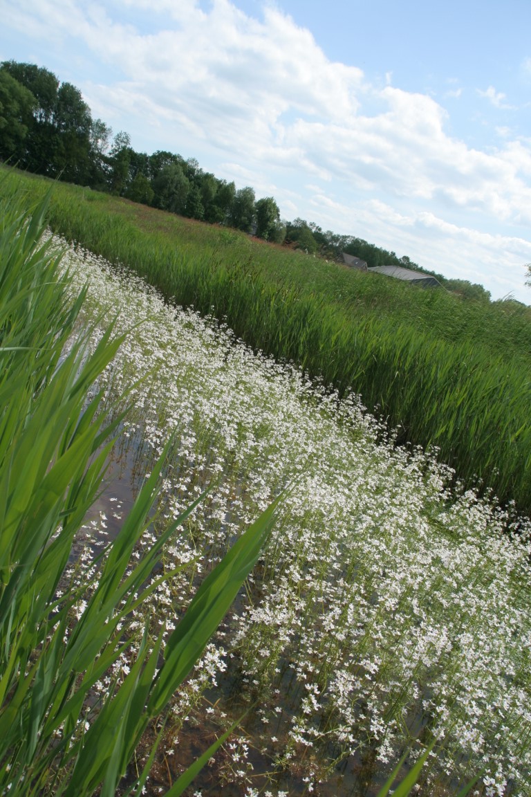 De hele sloot staat vol met waterviolier. Waterviolier is een plant met ondergedoken bladeren die voorkomt in ondiepe wateren.