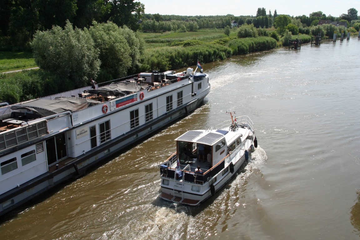 De kanovaarder op de onderste foto bleef angstvallig aan de kant bij het passeren van de grote boot.