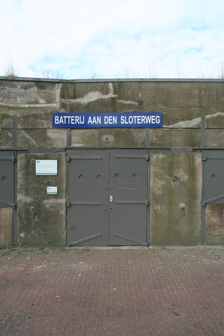 De linie door de Haarlemmermeer is een van de markantste delen van de Stelling, bestaande uit de Geniedijk, drie forten, twee batterijen, drie nevenbatterijen, aarden geschutsopstellingen en drie damsluizen. De Batterij aan de Sloterweg uit 1906 diende als een soort tussenfort dat door de grote afstand tussen de forten bij Aalsmeer en bij Hoofddorp – circa vijf km – noodzakelijk was om ondersteuningsvuur te kunnen geven aan de twee buurforten. De Batterij aan de Sloterweg (tegenwoordig Rijnlanderweg) uit 1906 is, in tegenstelling tot de Batterij aan de IJ-weg, goed bewaard gebleven. Omdat een brede onderwaterzetting voor de batterij mogelijk was, behoefde het niet als sterk fort opgezet te worden. Ondanks dat het hier om een klein verdedigingswerk gaat, heeft het ontwerp overeenkomsten met de grotere stellingforten. Zo is het hoofdgebouw met legeringruimten via een overdekte betonnen verbindingsgang (poterne), waar geschut stond opgesteld, met het frontgebouw verbonden.