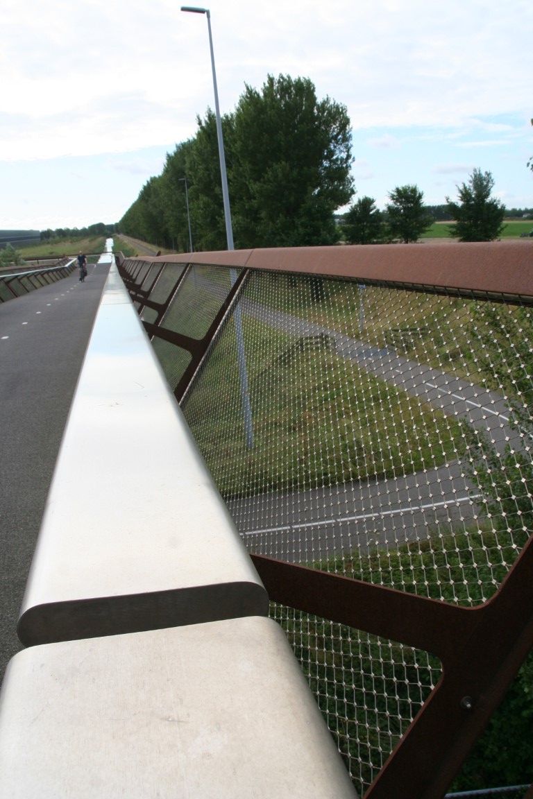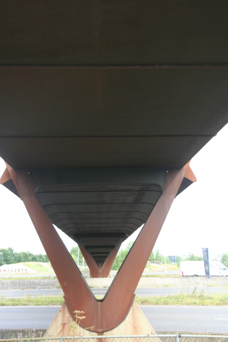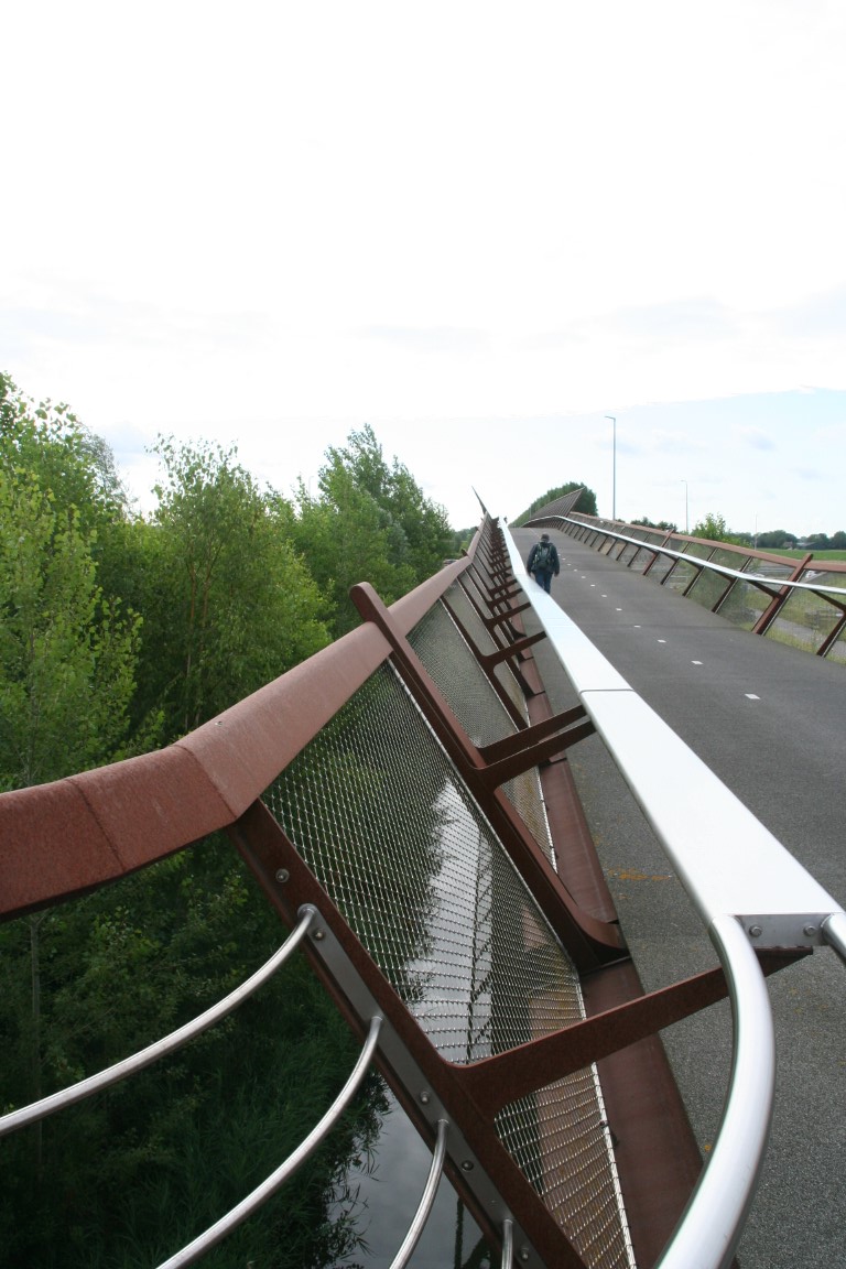 De brug is zo ontworpen dat deze niet op de geniedijk ligt, maar er parallel naast om de dijk in de waarde te laten en beter te ervaren door het afstand nemen via de op- en afgaande lus. De overspanning loopt in het verlengde van het achterkanaal, waarbij de brugpilaren in het water staan. Het water loopt onder de weg door en is begaanbaar voor kano’s. Er is voor de achterzijde gekozen omdat dat de ‘vriendelijke’ kant van de dijk is. Aangeplante bomen aan deze zijde symboliseren verdedigende soldaten.