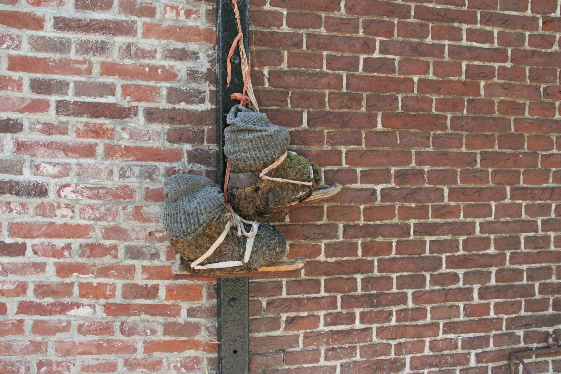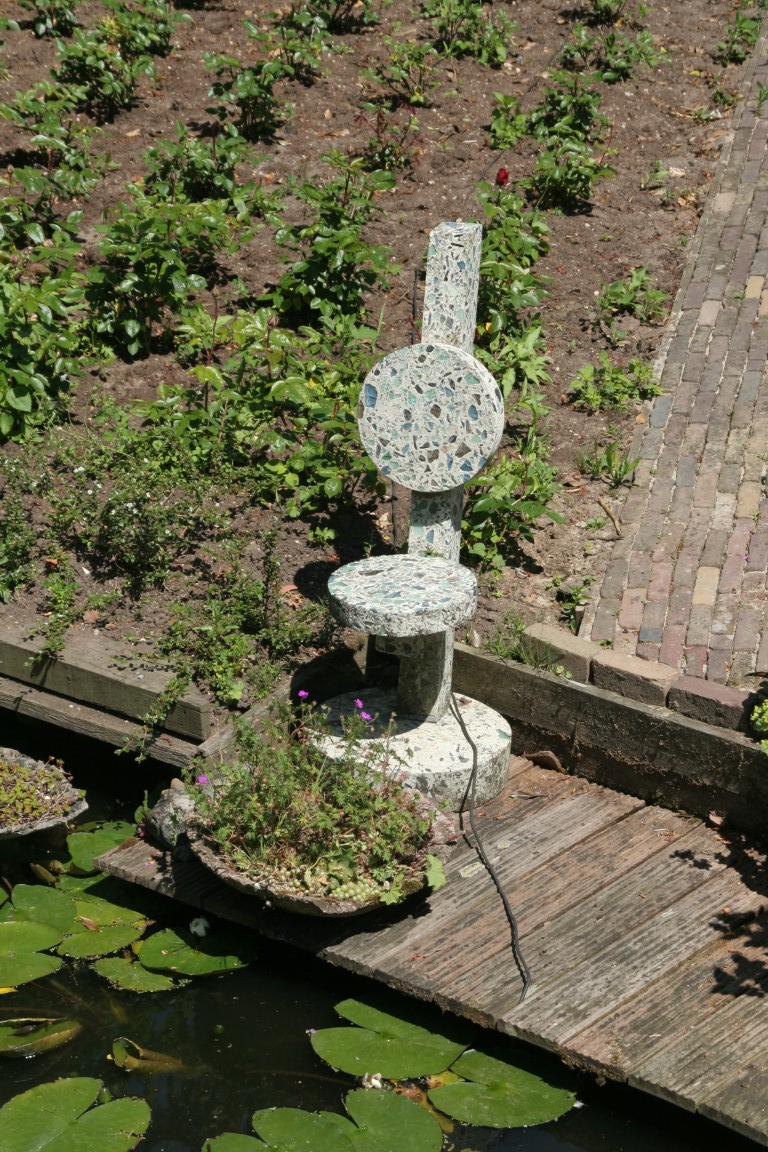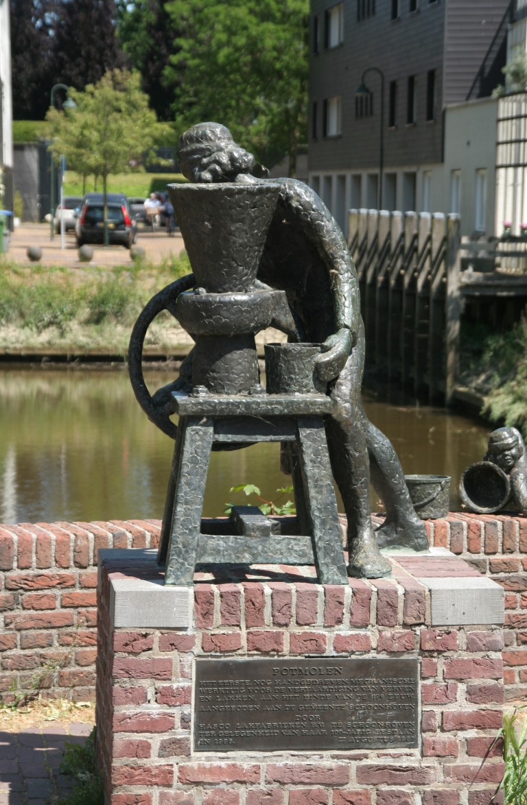 Op de twee rechtse foto’s een standbeeld van een arbeider die aan het wiel van een potmolen om verf te bereiden. Achter de arbeider op de brugleuning ligt een kereltje met twee verfpotten te wachten tot zijn bestelling klaar is.
