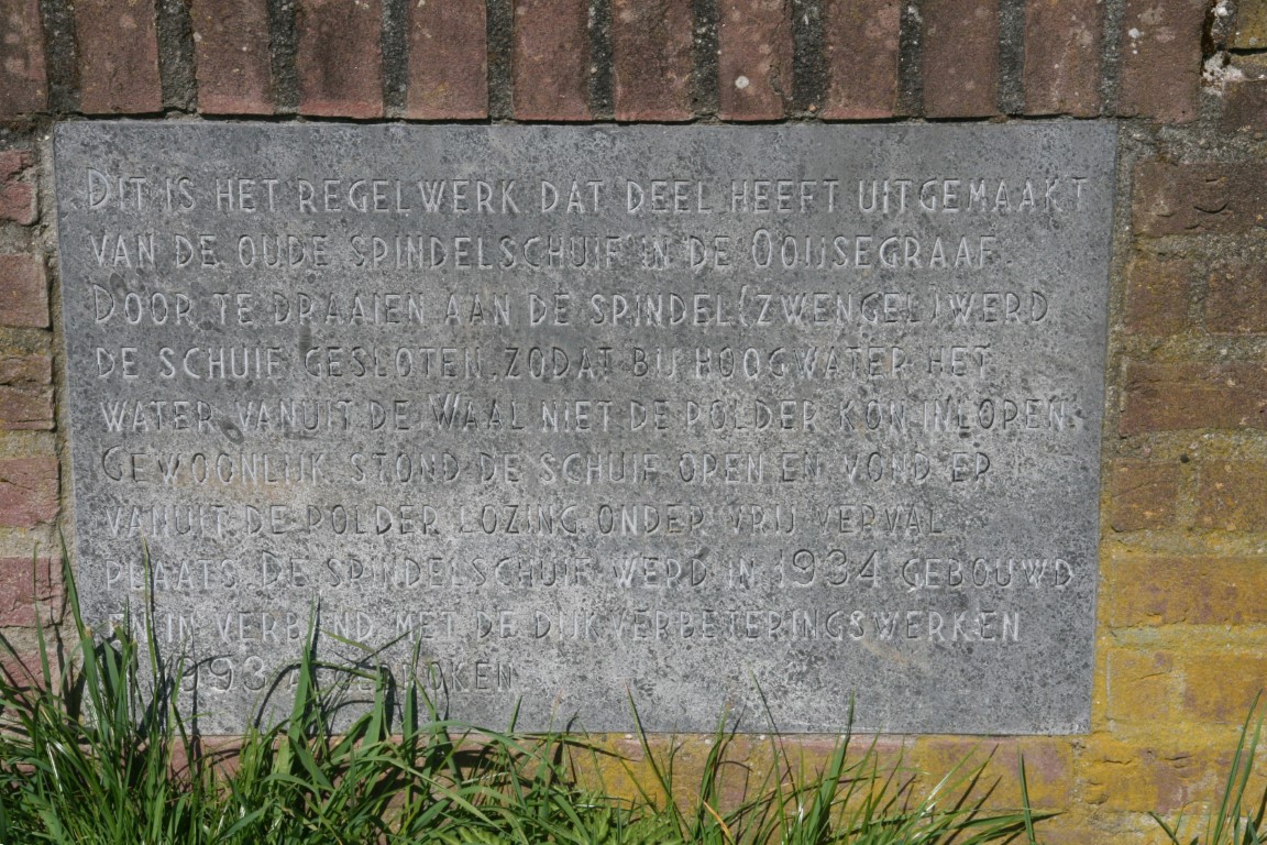 Gietijzeren kast met daarin het drijfwerk van een spindelschuif, geplaatst op een bakstenen, met natuursteen gedekte langwerpige sokkel. Door aan de spindel (zwengel) te draaien kon men de schuif sluiten, zodat rivierwater bij hoogwater niet in de polder kon stromen.