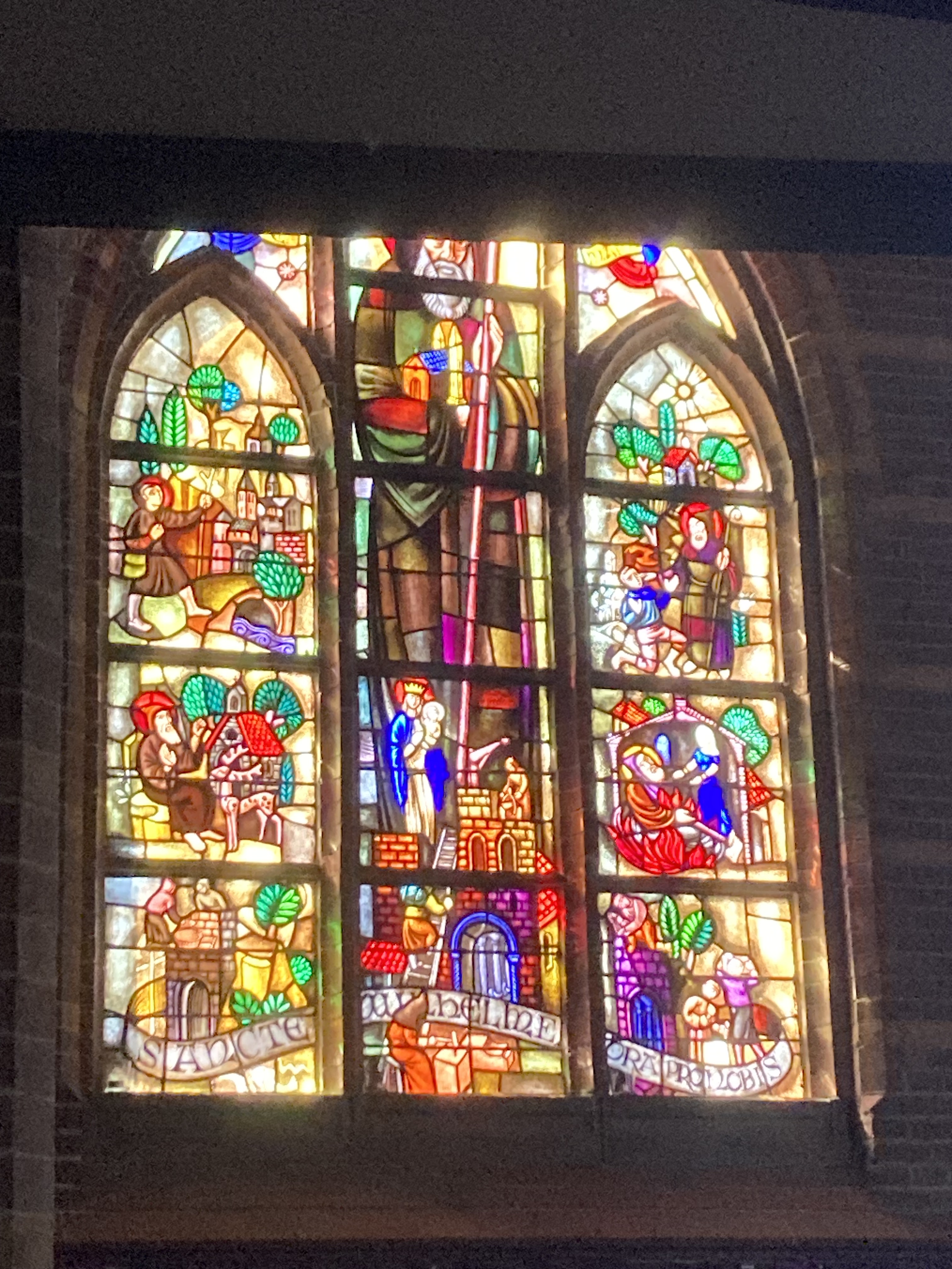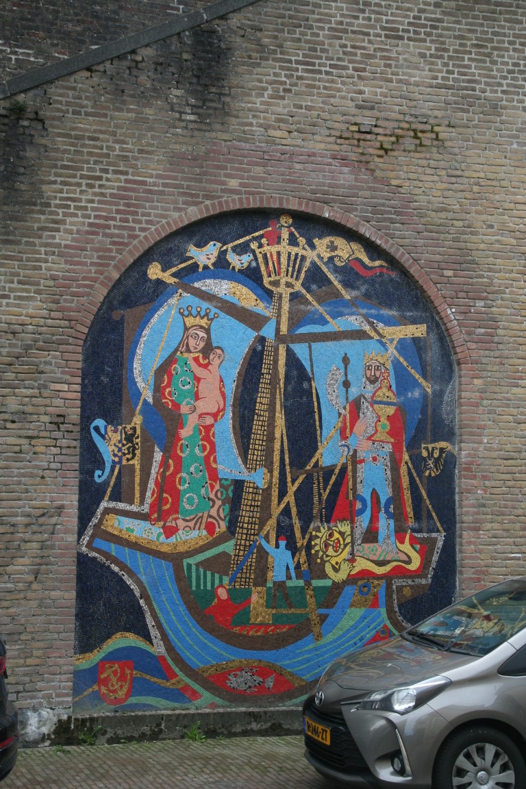 Afgebeeld is een schip met volle zeilen met links van de mast Moeder Gods met kind in een kleurrijk gewaad. Rechts van de mast staat Sint Olof, die in de 15e eeuw de patroonheilige of beschermer van de schippers in Nijmegen was. Zij hadden een eigen Olofkapel aan de Waalkade. Inspiratiebron voor dit werk is het Nijmeegse Antependium uit 1494. Volgens een legende raakt bij een onverwacht hevige storm een schip met pelgrims in gevaar. De mast stond op breken en de zeilen klapten dubbel. In nood roepen de pelgrims Olof te hulp. Hij brengt de storm tot bedaren. In de bisschopskerk van Myra herkennen de schepelingen Sint Olof. Zo wordt hij de beschermheilige van de schippers. Hij draagt een ciborie (kelk met deksel) als symbool van de verkondiging. Hij draagt een hellebaard (wapentuig) als teken dat hij een gewelddadige dood is gestorven. Ook draagt hij een kroon omdat hij koning was van Noorwegen. Met zijn voeten vertrapt hij een zeemonster als symbool van bestrijder van het heidens geloof.