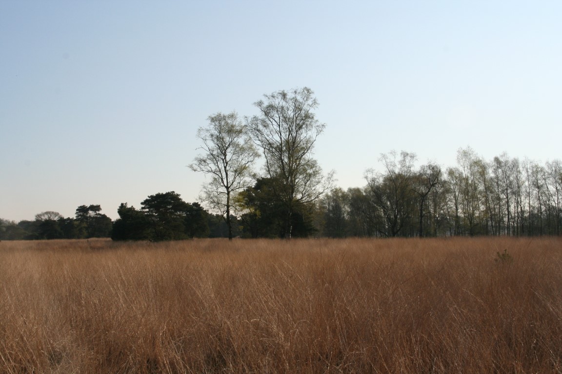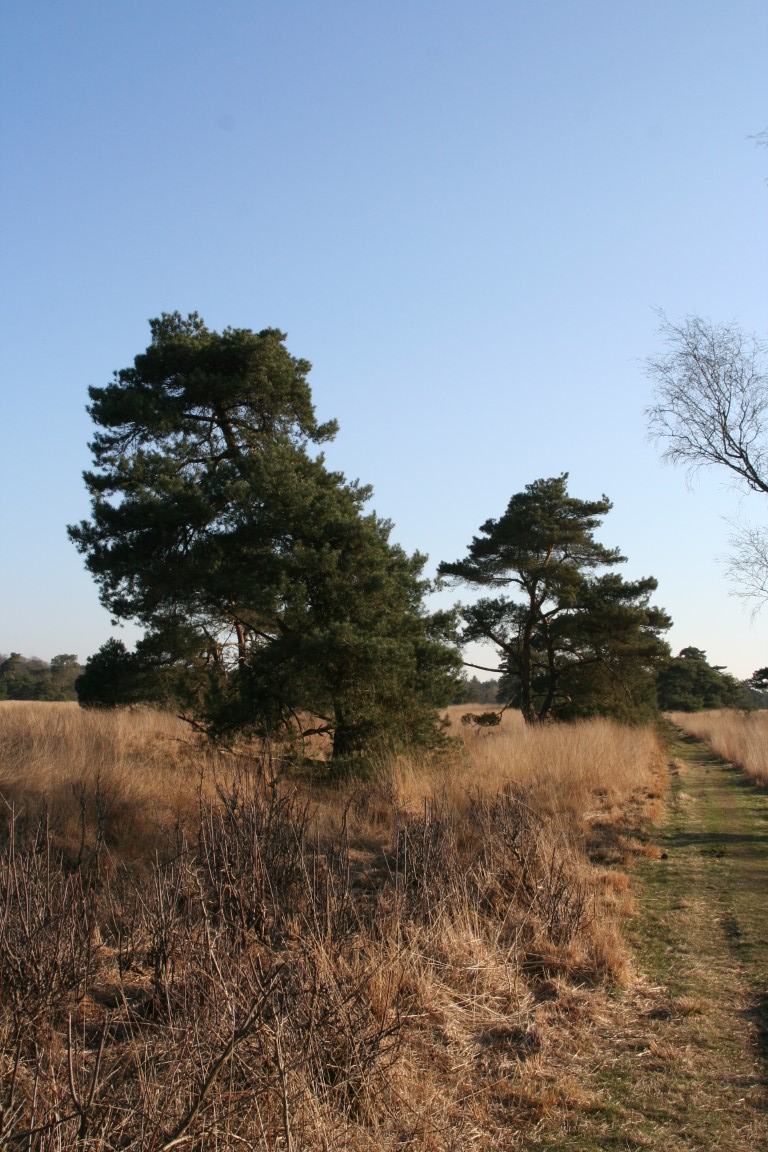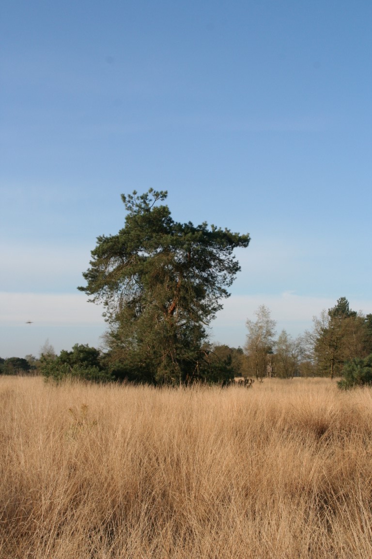 We wandelen verder en komen zo in een gebied terecht waar op de heide de grove den vrij spel heeft.