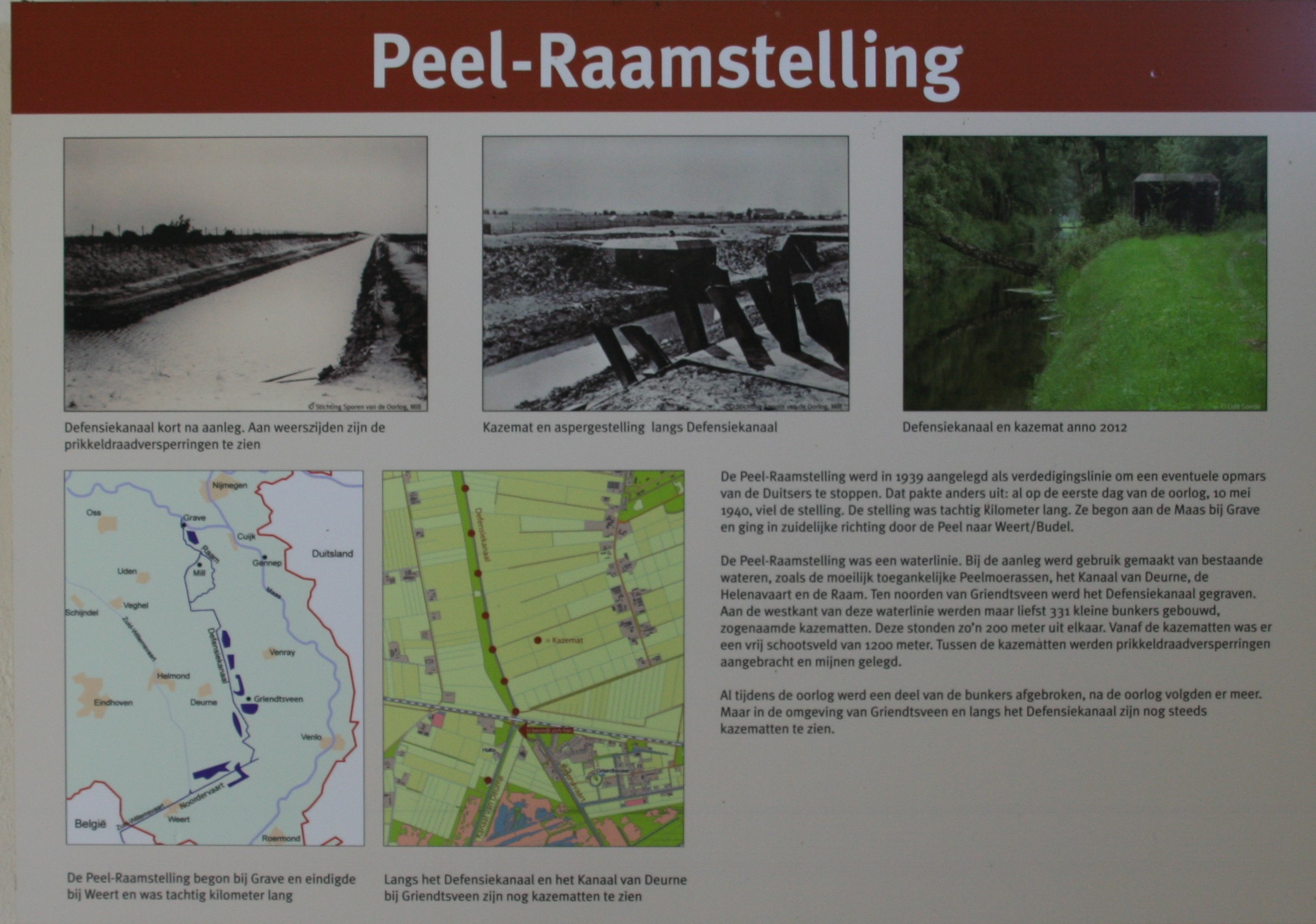 De Peel-Raamstelling liep vanaf de Belgische grens bij het dorp Dorplein tot aan Grave. De stelling was een echte waterlinie: een aaneengesloten strook van inundaties en versperringen. De stelling maakte gebruik van bestaande wateren, zoals de Raam en het Kanaal van Deurne, en van de drassige Peel. Bovendien werd tussen Mill en Griendtsveen het Defensiekanaal gegraven. Achter de natte versperringen lag een linie van kazematten. Het merendeel daarvan was van het model S, B of G. Bij Nederweert, een knooppunt van wegen en kanalen, werden nog vijf zware rivierkazematten aangelegd. De ruimten tussen de kazematten langs het Defensiekanaal werden verder afgesloten met prikkeldraadversperringen. Achter het Defensiekanaal kwamen nog mijnenvelden, loopgravenstellingen, commandoposten en afwachtingsdekkingen. Op 10 mei 1940 werd de Peel-Raamstelling verdedigd door de Peeldivisie: zes bataljons infanterie en een verouderde afdeling lichte artillerie. In de vroege ochtend van 10 mei brak een pantsertrein met troepen bij Mill door de stelling, zodat de eenheden die daarna in de rug konden aanvallen. Door daadkrachtig optreden van de Nederlandse artillerie en een regiment Huzaren-Motorrijders werd voorlopig erger voorkomen. Maar de commandant van de Peel-Raamstelling was al tot de conclusie gekomen dat de doorbraak bij Mill definitief was en het niet verantwoord was langer te wachten met terugtrekken. De Nederlandse troepen trokken zich vervolgens dan ook terug tot achter de Zuid-Willemsvaart. Het Defensiekanaal is nog grotendeels aanwezig en daarlangs liggen nog vele kazematten van het model S en B. De G-kazematten zijn meestal verdwenen, doordat de gietstalen koepels al in de oorlog door de Duitse troepen tot schroot zijn verwerkt.