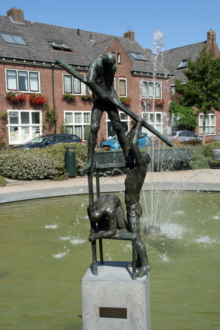 “Burgerzin” beeldt drie bouwvakkers uit die, met schroeven en planken in de hand, elkaar de helpende hand toesteken.