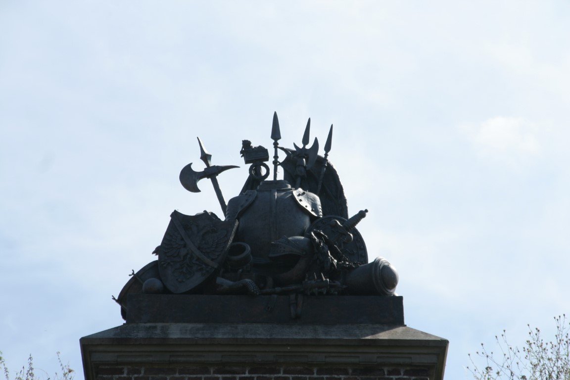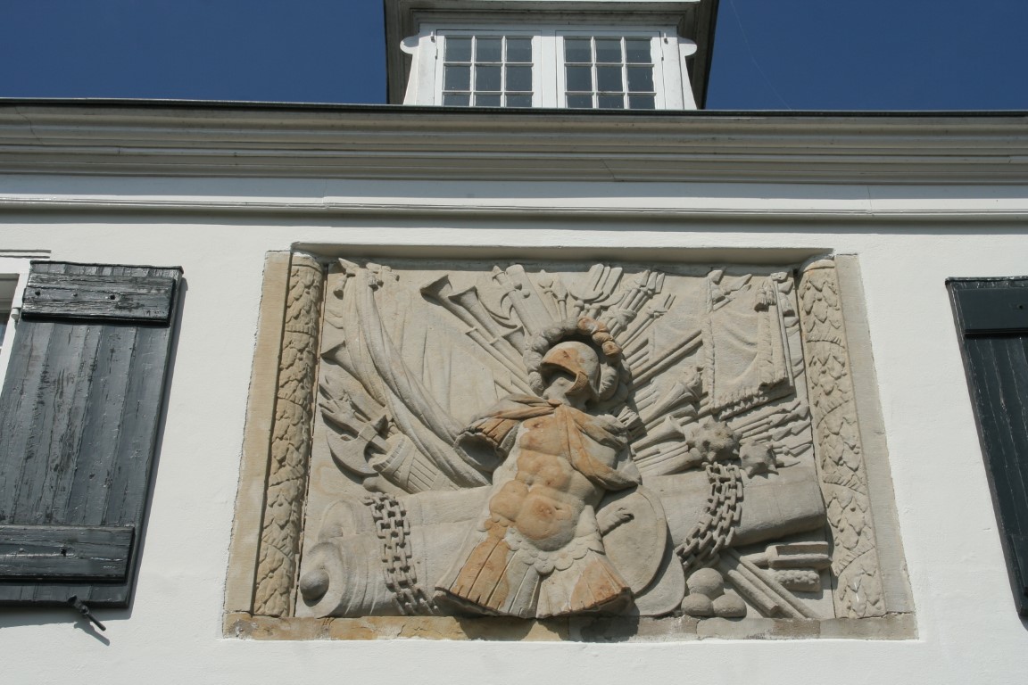 Het gebouw is rijk versierd met het wapen van de stad Naarden, een dubbele adelaar. In de nissen bevinden zich sculpturen die verwijzen naar de vestingbouw en het militaire bedrijf, een staande leeuw met zwaard en pijlen, een symbool van de Republiek der Zeven Verenigde Nederlanden.
