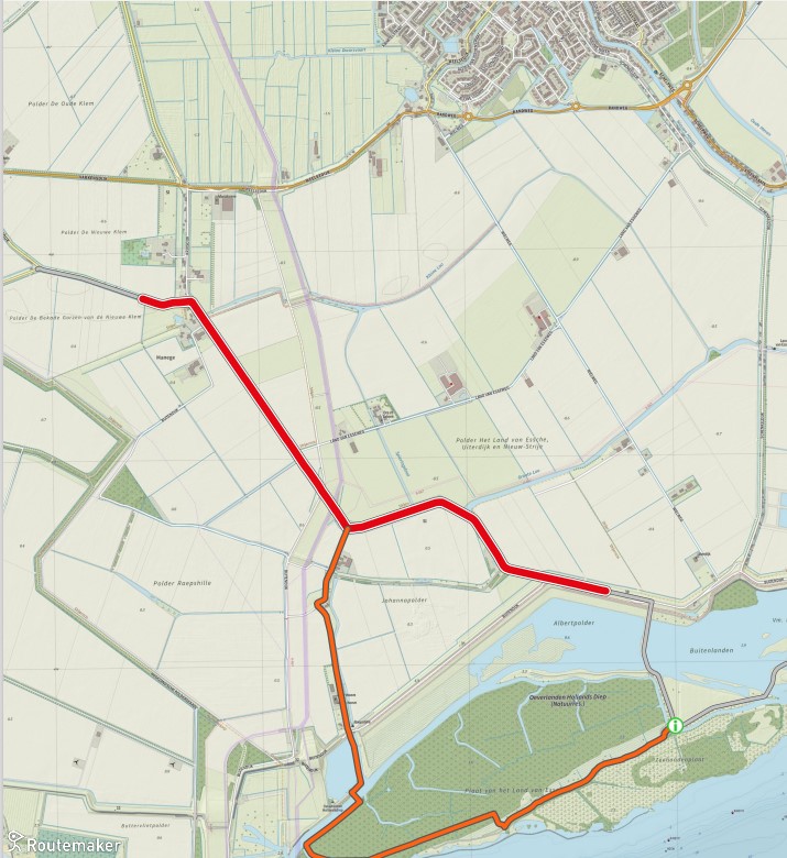 Volgens het boekje van de “reisleider” zouden we nu verder rechtdoor moeten terwijl de nieuwste route zegt dat we richting de Oosterse Bekade Gorzen moeten. Daar kiezen we dus voor.
