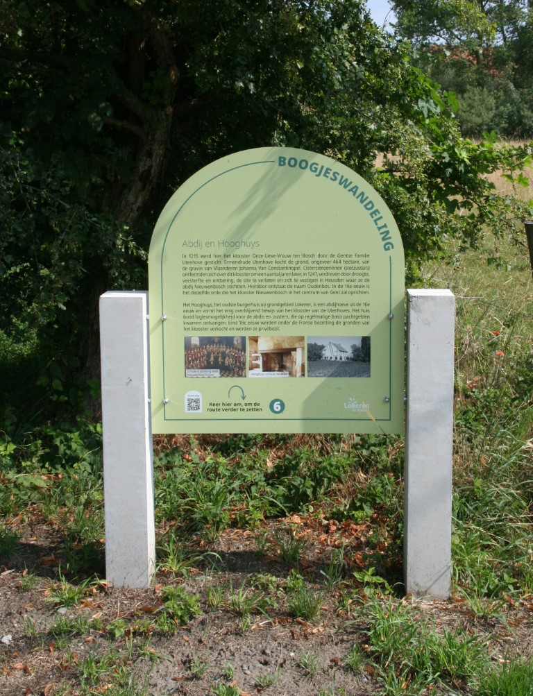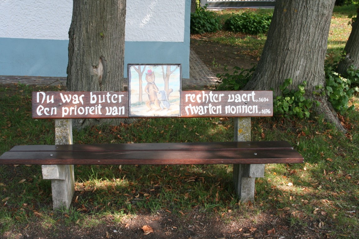 (“Nu was terzijde van het pad waar zij aan waren begonnen, een klooster van zwarte nonnen”). Onderstaand infobord staat bij de bank.