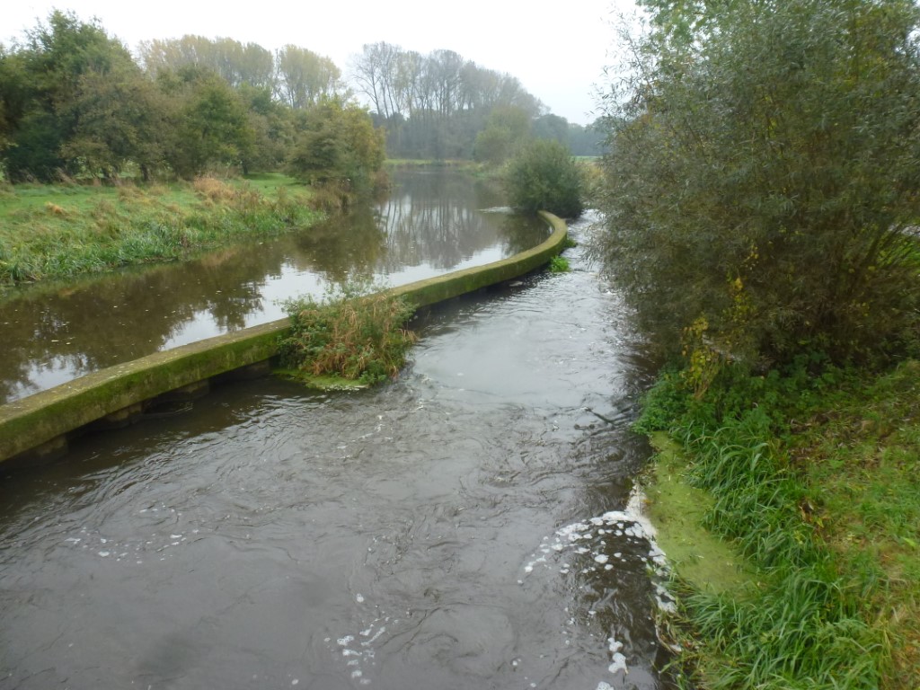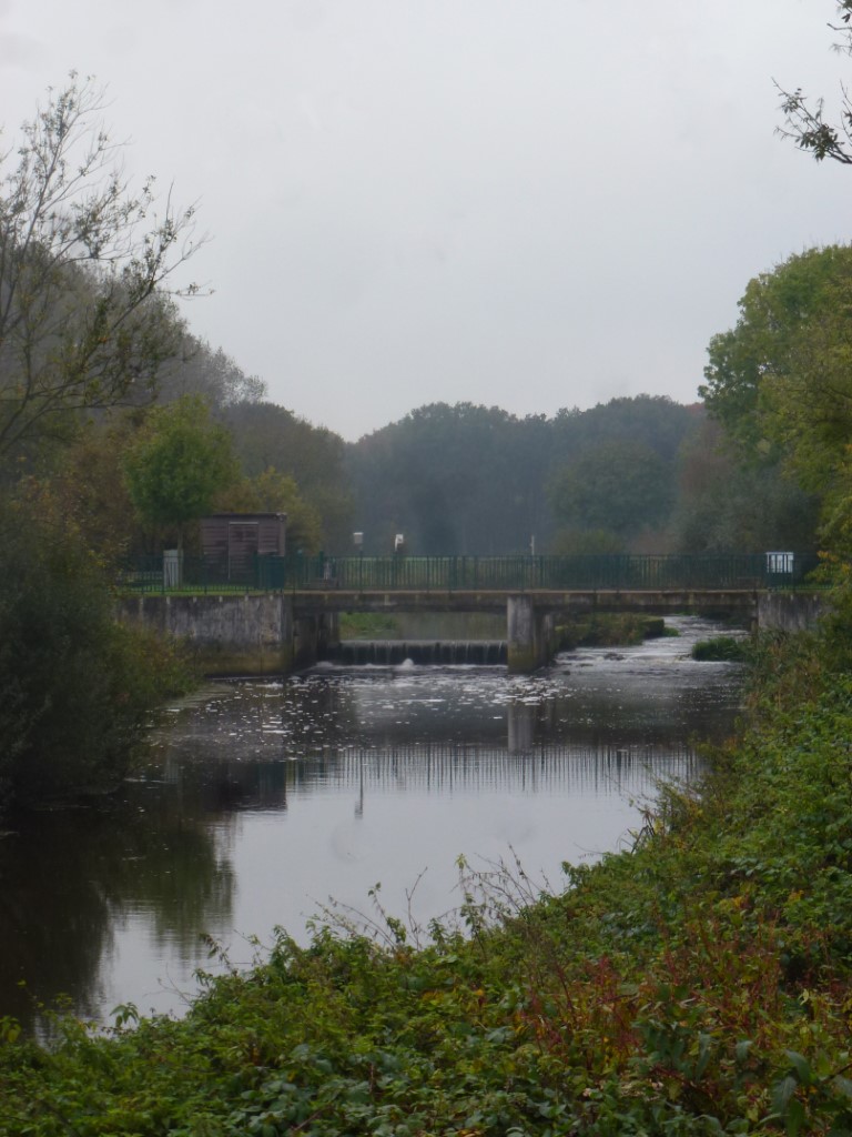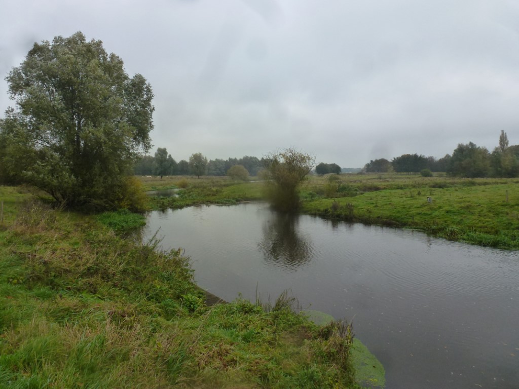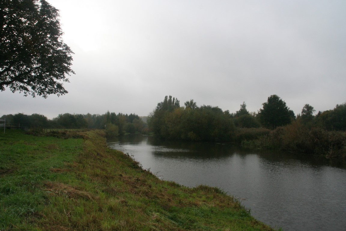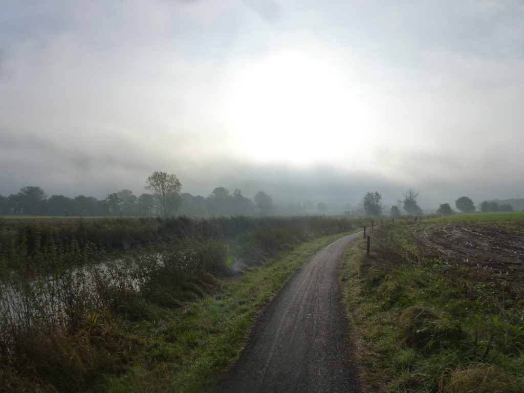 Ochtendnevel en een opkomend zonnetje langs het riviertje “de Mark” tijdens de fietstocht naar het beginpunt van de wandeling.