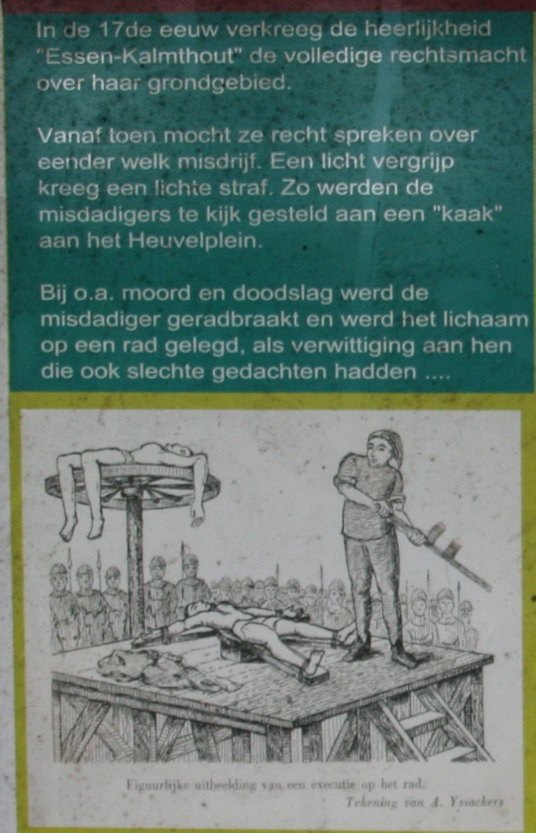 In Essen en Kalmthout werden op zeker 2 plaatsen executies uitgevoerd. De belangrijkste en wellicht ook de oudste plaats is gelegen bij Boterbergen, maar ook de Raeybergh was toendertijd een beruchte plaats. De plaats bevond zich steeds vlakbij een postbaan, om vreemdelingen te verwittigen dat misdaad zwaar gestraft werd. Bovendien waren ze ook op een uithoek gelegen omdat niemand vlakbij zo’n akelige plaats wou wonen. De lijken bleven trouwens liggen tot ze totaal ontbonden waren.