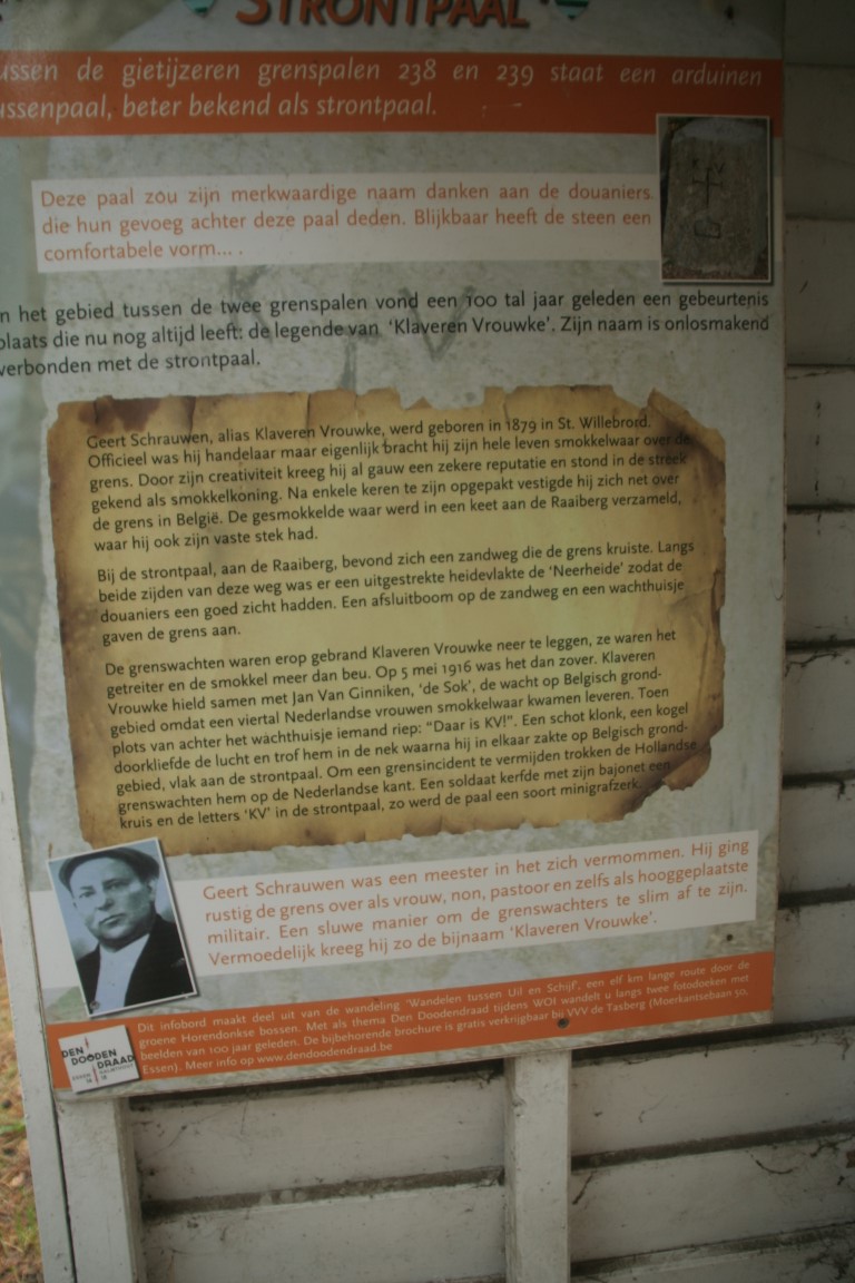 In de streek (Horendonk-Essen) wordt deze paal “De Strontpaal” genoemd, omdat vroeger, tijdens W.O.I, de douaniers van de nabij gelegen grenspost, tijdens hun velddienst, hun behoefte al eens deden achter deze paal. Ook werd bij deze tussenpaal in mei 1916 de beroemde smokkelaar Geert Schrauwen, bijgenaamd Klaveren Vrouwke, door Nederlandse grenswachters doodgeschoten. Klaveren Vrouwke was in de oorlog 14-18, tijdens de gouden tijden van de smokkelaars, een man die steeds anders vermomd, smokkelwaar over de grens bracht en tot ergernis van de grenswacht ongrijpbaar bleef. Nabij “De Strontpaal” is Klaveren Vrouwke op 5 mei 1916 dan toch doodgeschoten. Ter herinnering aan dit feit werden door een soldaat met zijn bajonet in de steen een kruis en de letters KV gekerfd. Begin de jaren 70 werd bij het uitdunnen van het bos het bovenste gedeelte van “De strontpaal” eraf gereden. Het stuk werd terug op zijn plaats gezet, maar deze arduinen paal werd echter gestolen. Later werd hij vervangen door een betonnen exemplaar. Dank zij enig speurwerk werd de oorspronkelijke strontpaal in 2004 teruggevonden. Hij stond in de achtertuin van een nazaat van Klaveren Vrouwke in St. Willebrord.