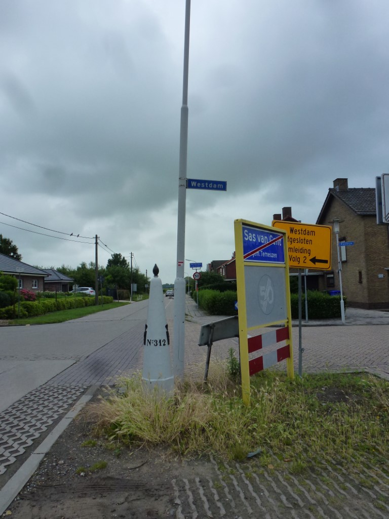 Grenspaal 312 op de Nederlands-Belgische grens tussen Sas van Gent en Assenede op de kruising tussen Westdam, Poeldijk/Poeldijkstraat, Staakstraat en Vrijstraat.