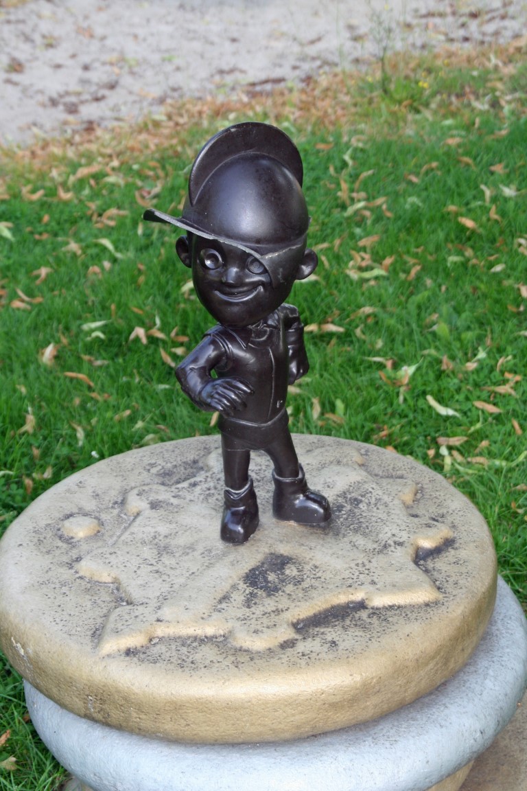Op het hoge voetstuk een metalen plaat met de tekst: