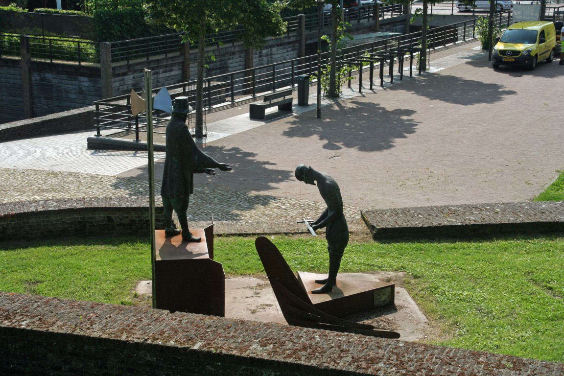 Een overwonnene die met gebogen hoofd zijn zwaard aanbiedt aan de overwinnaar. De overwonnene staat op een laag stalen voetstuk, de overwinnaar op een hoger voetstuk.