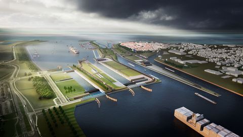 Impressie van het sluizencomplex zodra de nieuwe sluis eind 2024 gereed is.