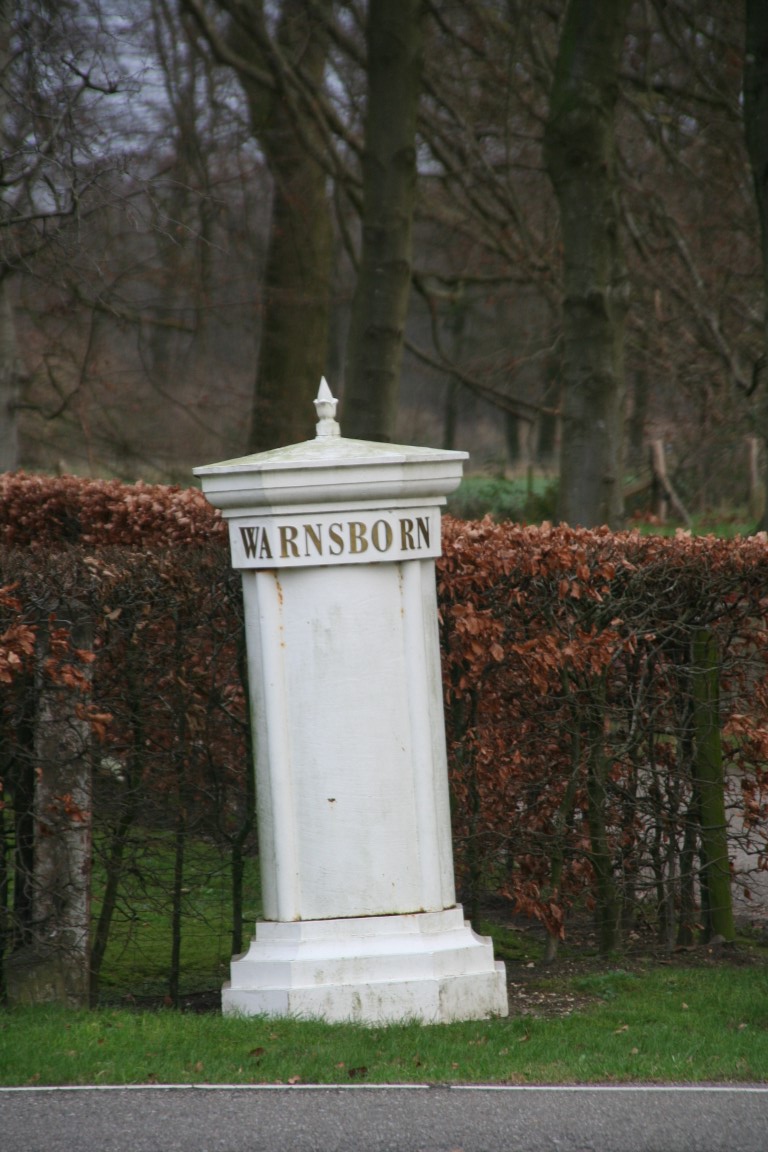 Twee wit geschilderde gietijzeren HEKPALEN met opschrift WARNSBORN uit omstreeks 1870. De posten werden geplaatst aan weerskanten van de wegen die toegang verlenen tot het landgoed. Staan op een gemetselde sokkel. De posten bestaan uit een cilindervormig lichaam met vier colonetten en staan op een achtzijdig geprofileerd basement. Aan de bovenzijde een dito dekstuk dat aan de bovenzijde licht conisch toeloopt met aan de voorzijde de vermelding ‘Warnsborn’.