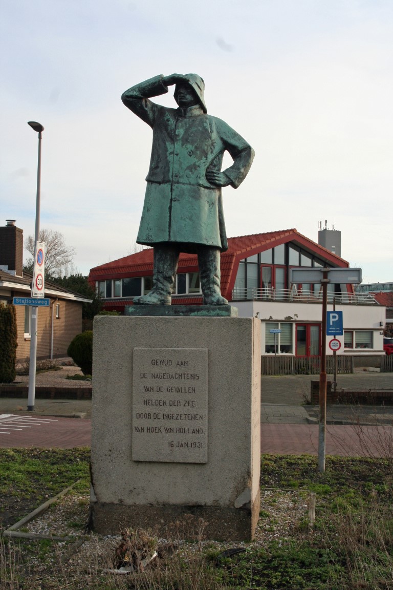 Standbeeld “de Redder”. Het beeld is gewijd aan alle omgekomen redders van Hoek van Holland (‘gewijd aan de gevallen helden der zee’). Het beeld kreeg als naam ‘Heldendood’.