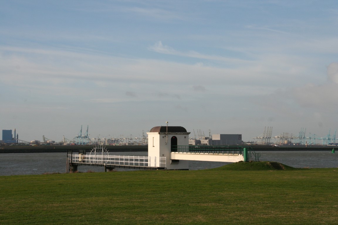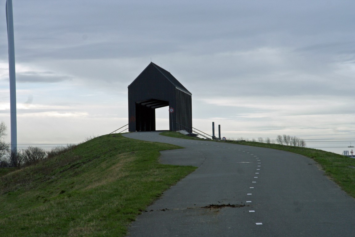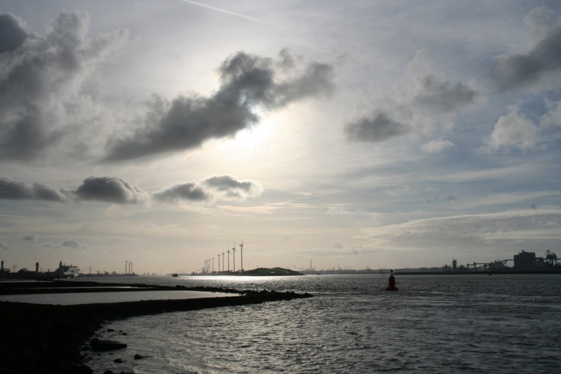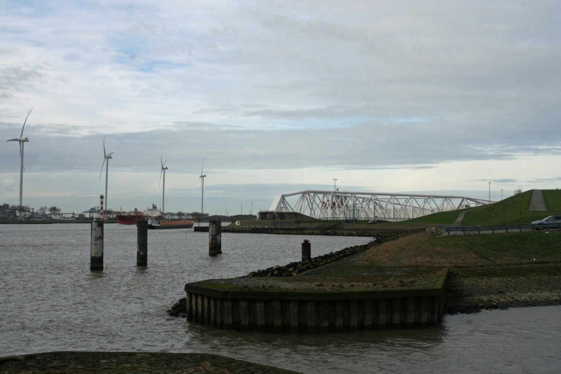 Na de brug te hebben gepasseerd komt de route weer bij de Nieuwe Waterweg waar we de Maeslandkering zien.
