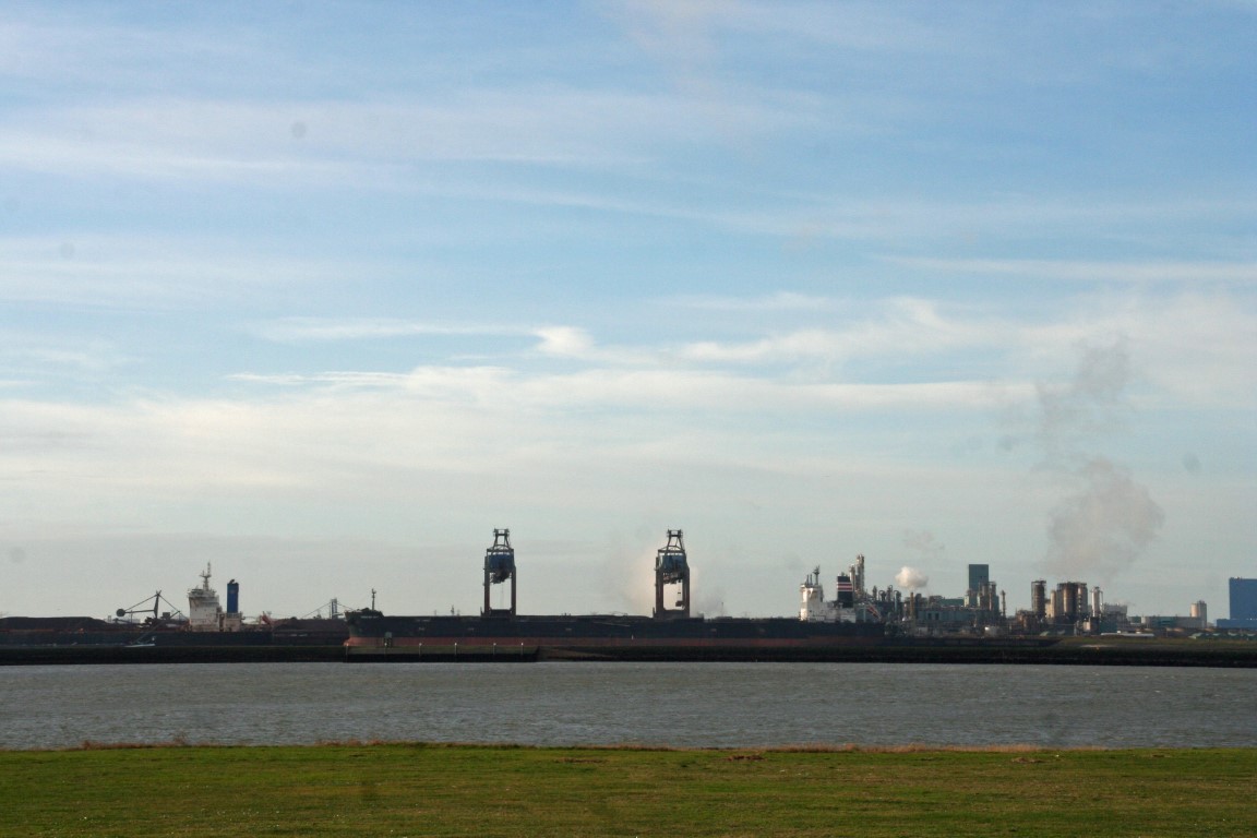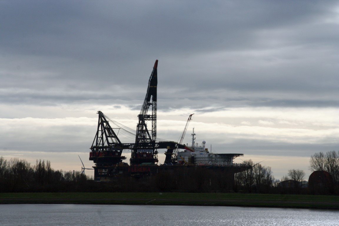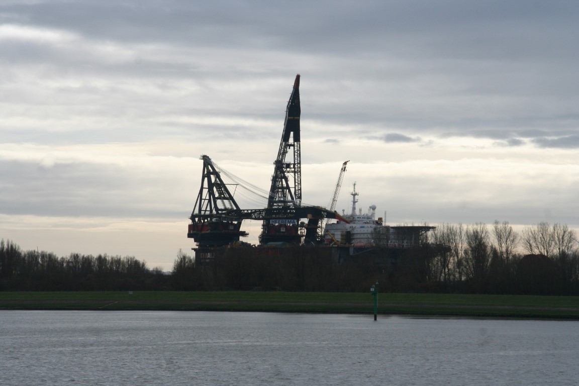 De wandeling gaat verder langs De Nieuwe Waterweg richting Maassluis. Daarbij zien we het kraanschip Thialf van de firma Heerema liggen in het Calandkanaal.