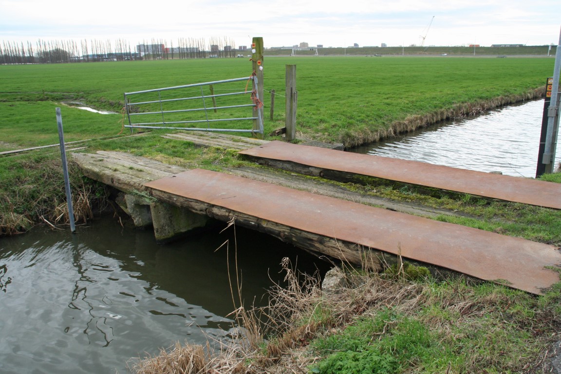 Een opvallende brug in het landschap over de metrolijn richting Hoek van Holland.