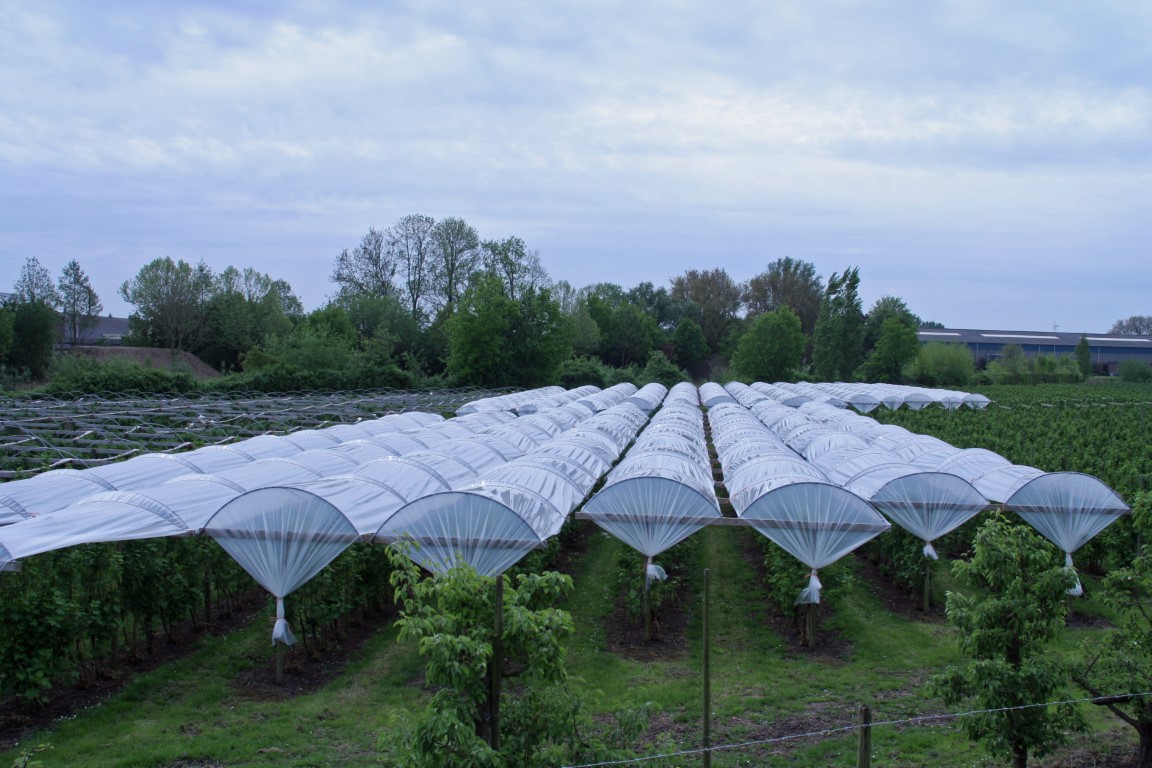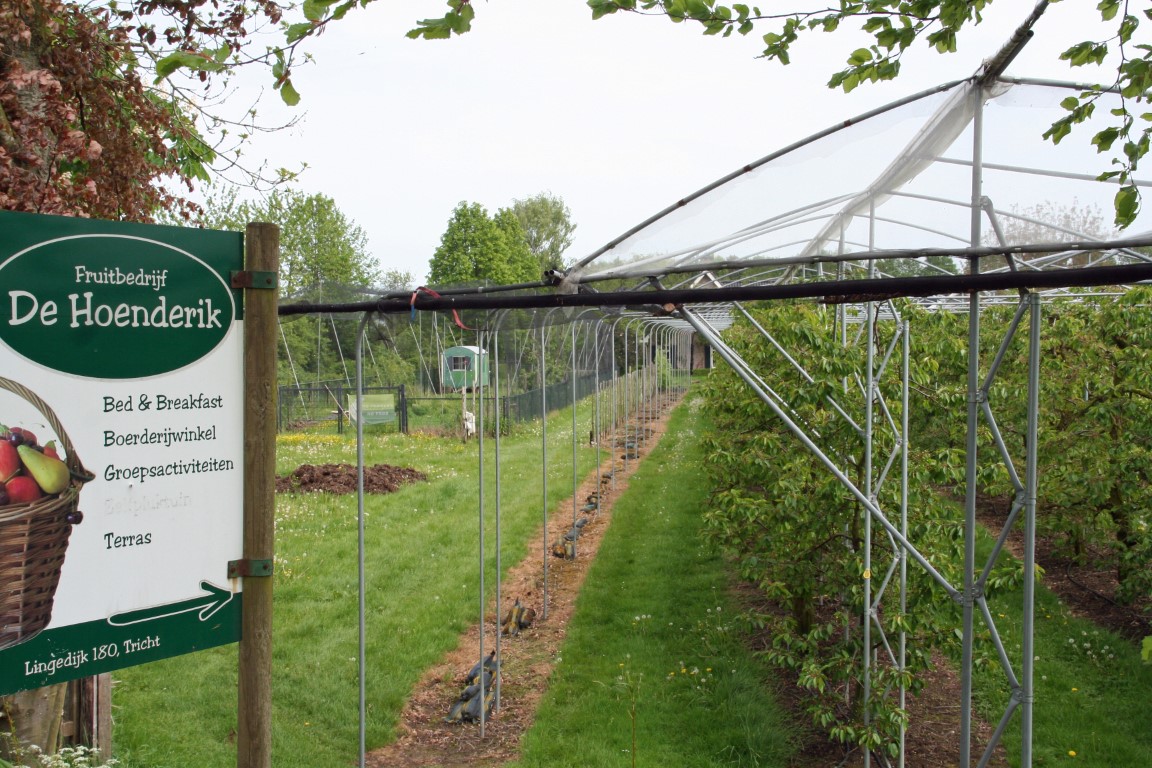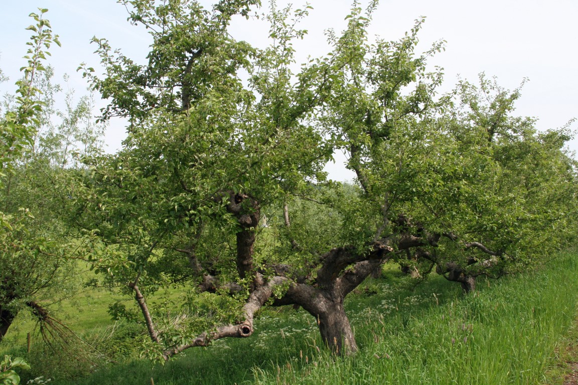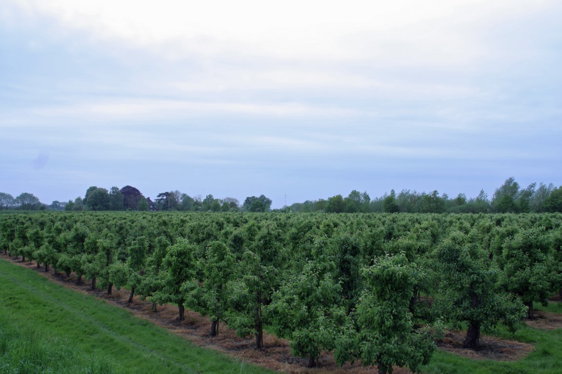 We wandelen door de Betuwe wat goed te zien is aan het aantal boomgaarden.