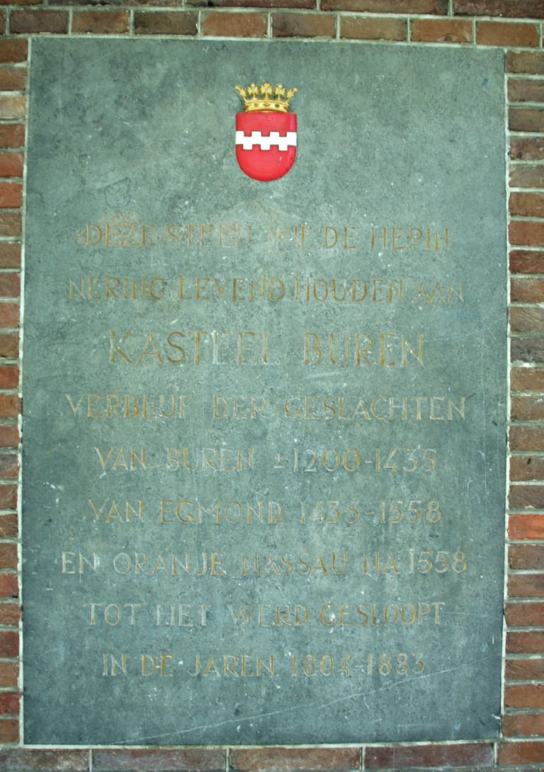 Deze steen wil de herinnering levend houden aan Kasteel Buren Verblijf der geslachten van Buren ±1200 – 1435, Van Egmond 1435 – 1558 en Oranje Nassau na 1558 tot het werd gesloopt in de jaren 1804 – 1883