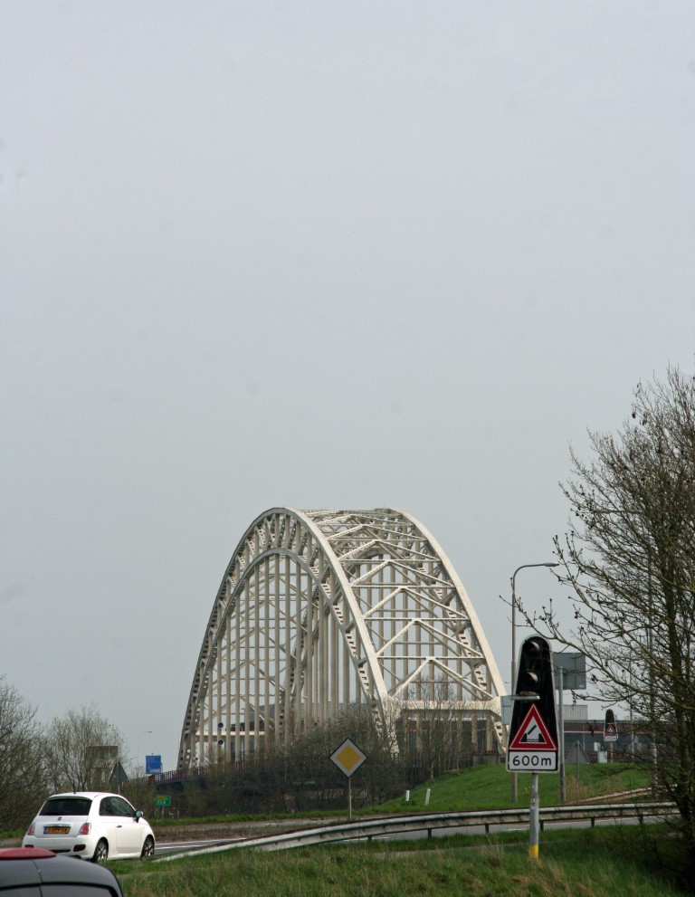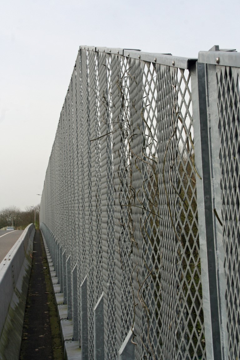 We passeren de A-16. Op de brug over de snelweg staat onderstaand hekwerk. Alles om te voorkomen dat er iemand over het hek kan springen of iets op de snelweg kan gooien.